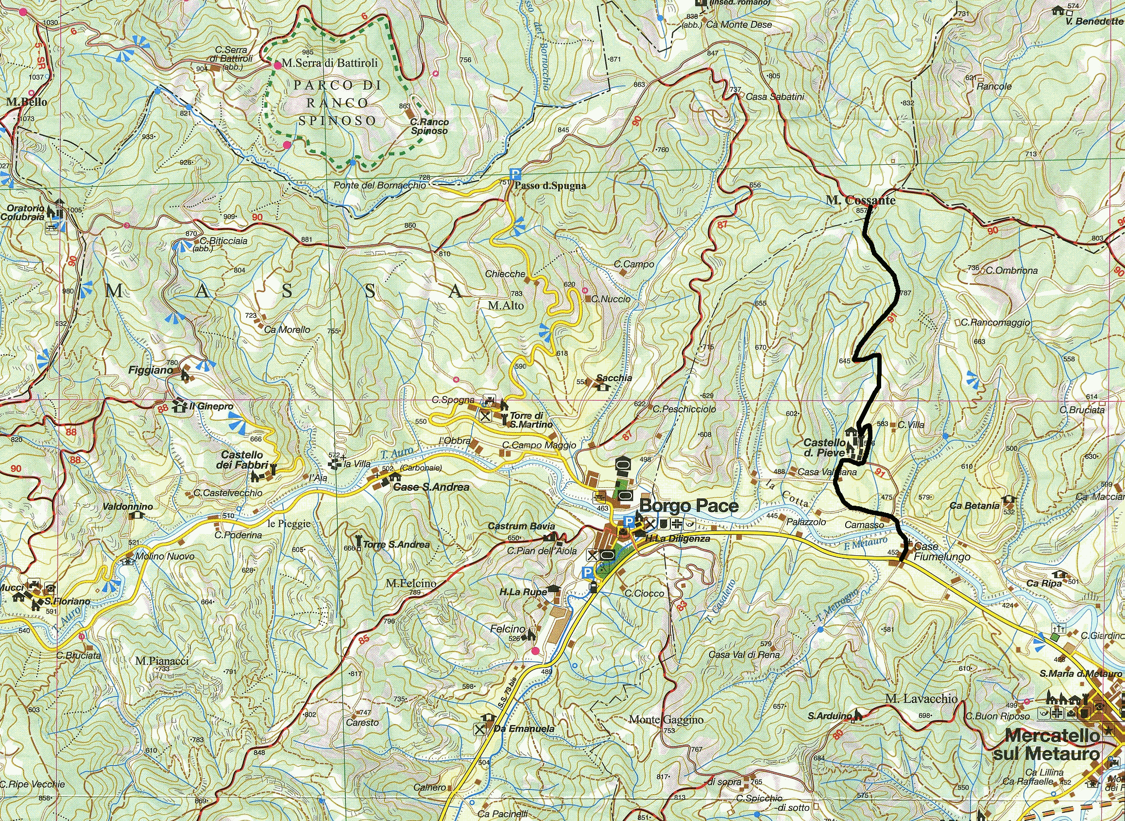 In questo punto il percorso termina incrociando il sentiero 90, uno dei tracciati più importanti dell'intero comprensorio che collega Mercatello sul Metauro alla dorsale principale dell'Alpe della Luna.