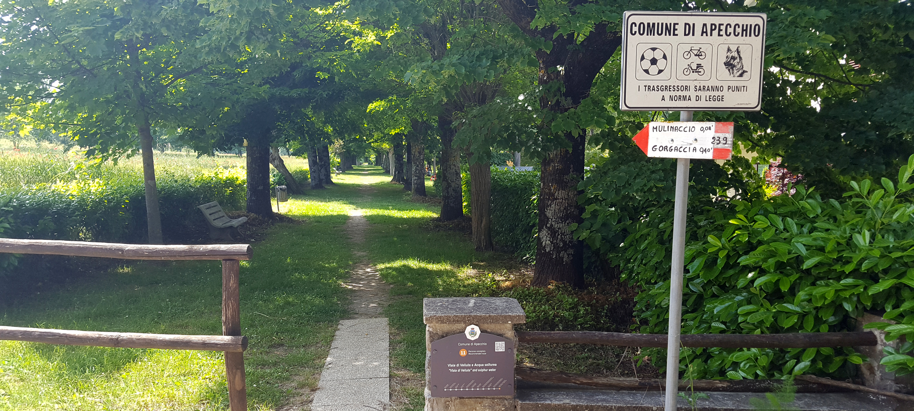 L’attacco del sentiero si trova vicino al centro di Apecchio, all’inizio del Piano di Velluto, dove si attraversa un parco pubblico nel quale è possibile effettuare rifornimento idrico presso una fontanella, prima di sbucare sulla strada che conduce al vicino cimitero, nei pressi della grande fonte di acqua sulfurea, molto apprezzata per le sue qualità benefiche.
