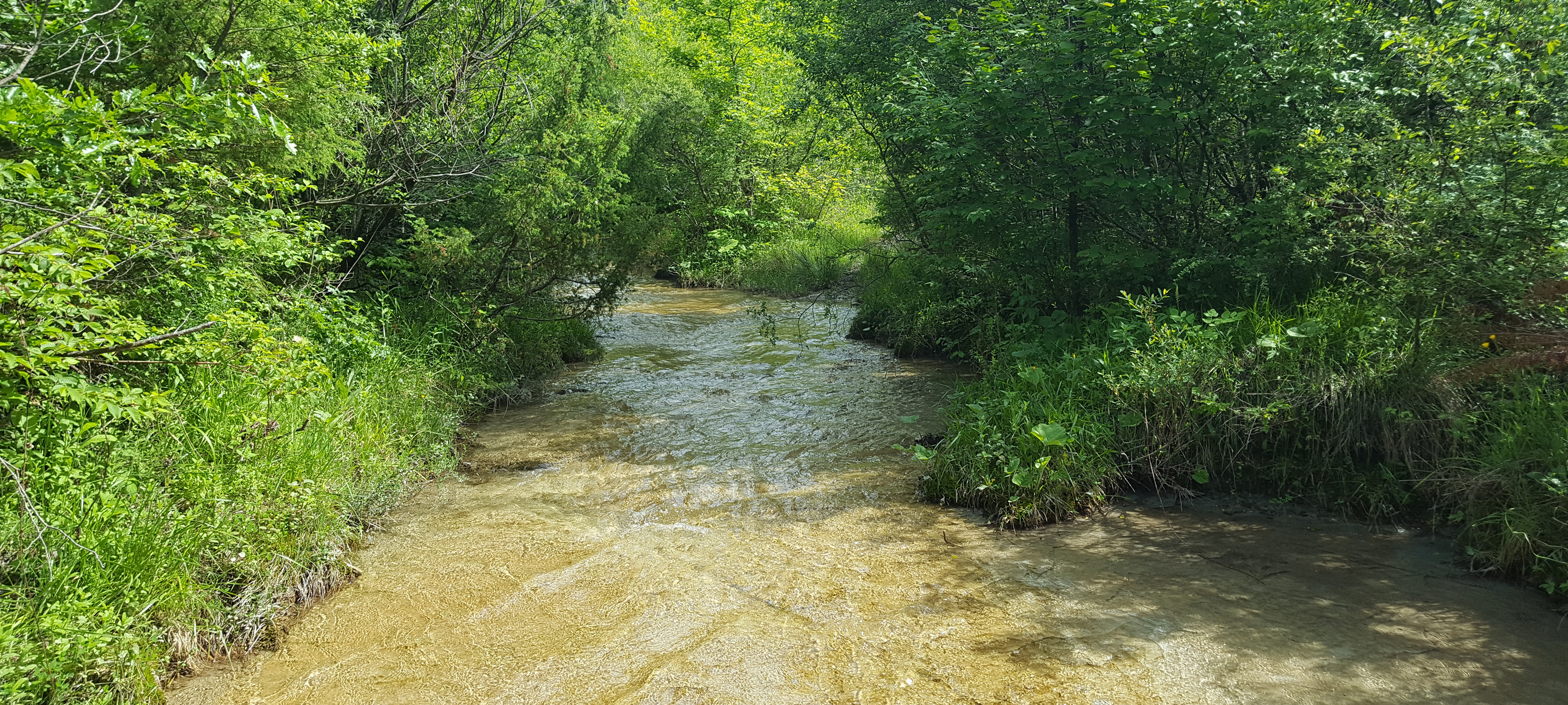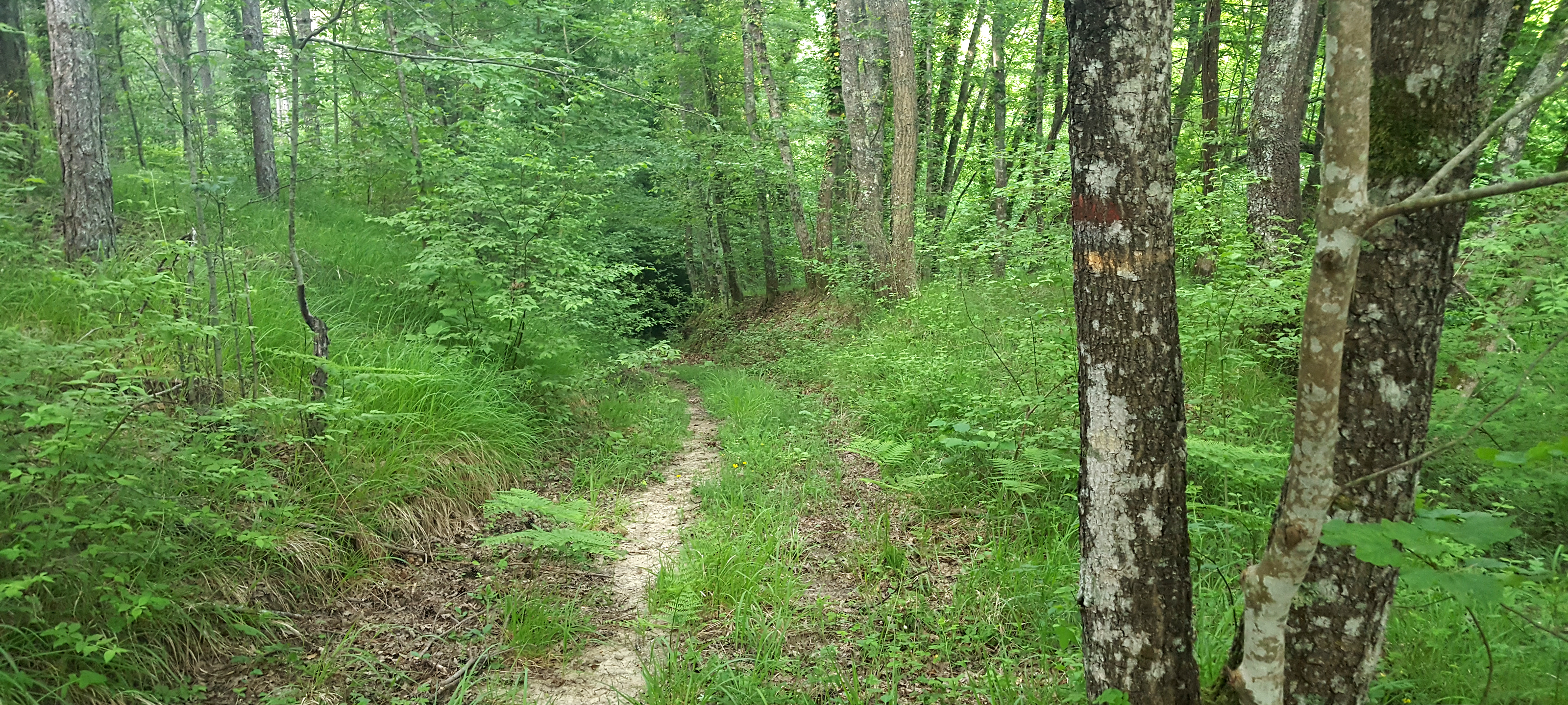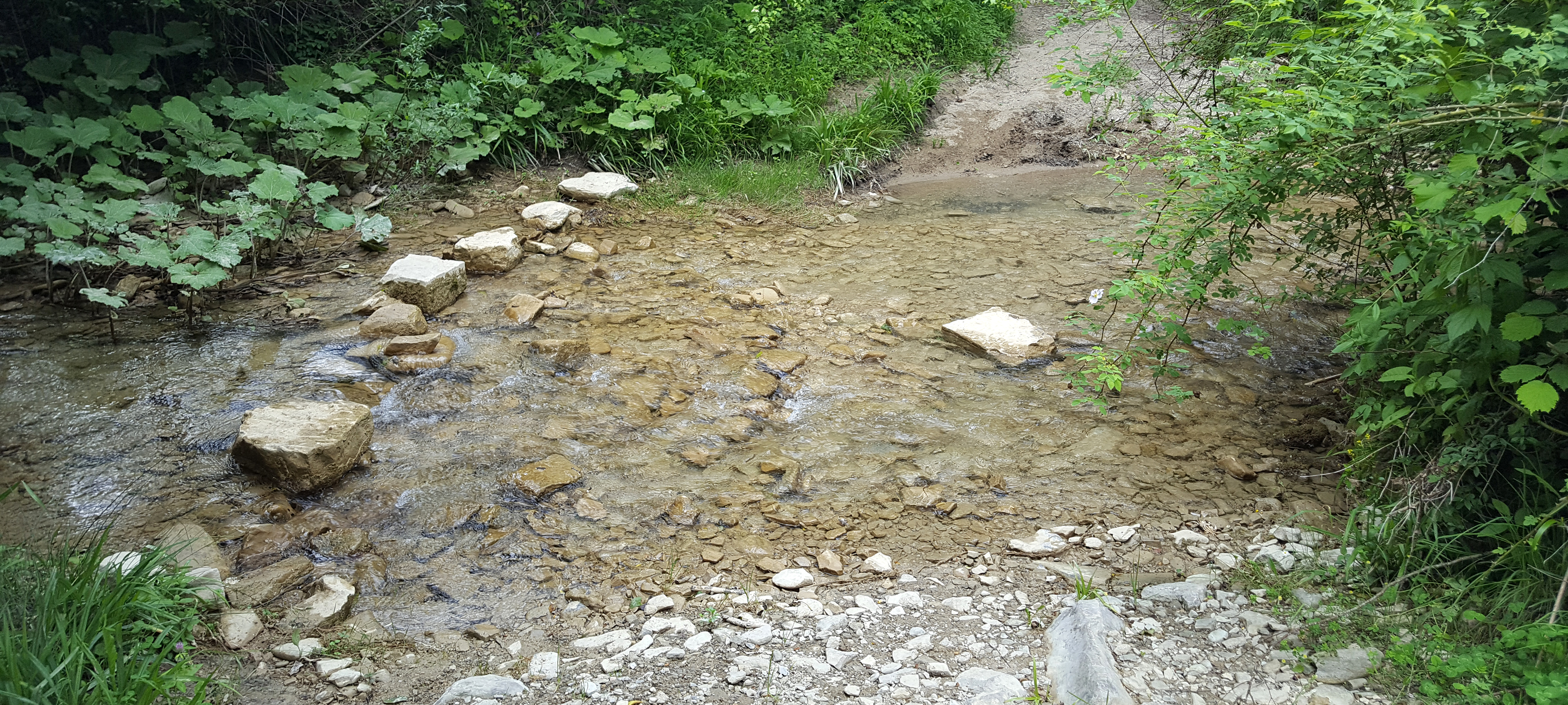 Si prosegue a fianco del corso d’acqua, seguendo alcuni vecchi segni a mala pena intravedibili sugli alberi, fino a giungere ad un lungo guado sul fosso (almeno una cinquantina i metri da percorrere in acqua, fortunatamente la profondità in questo punto è bassa), oltrepassato il quale si prosegue lasciandosi sempre l’alveo sulla sinistra, su una debolissima traccia che attraversa i boschi e in alcuni punti sbuca sui prati circostanti, sempre per breve tempo per poi tornare verso il fosso che viene intersecato più volte (almeno una decina di guadi, alcuni piuttosto insidiosi con molto fango e acqua piuttosto alta).