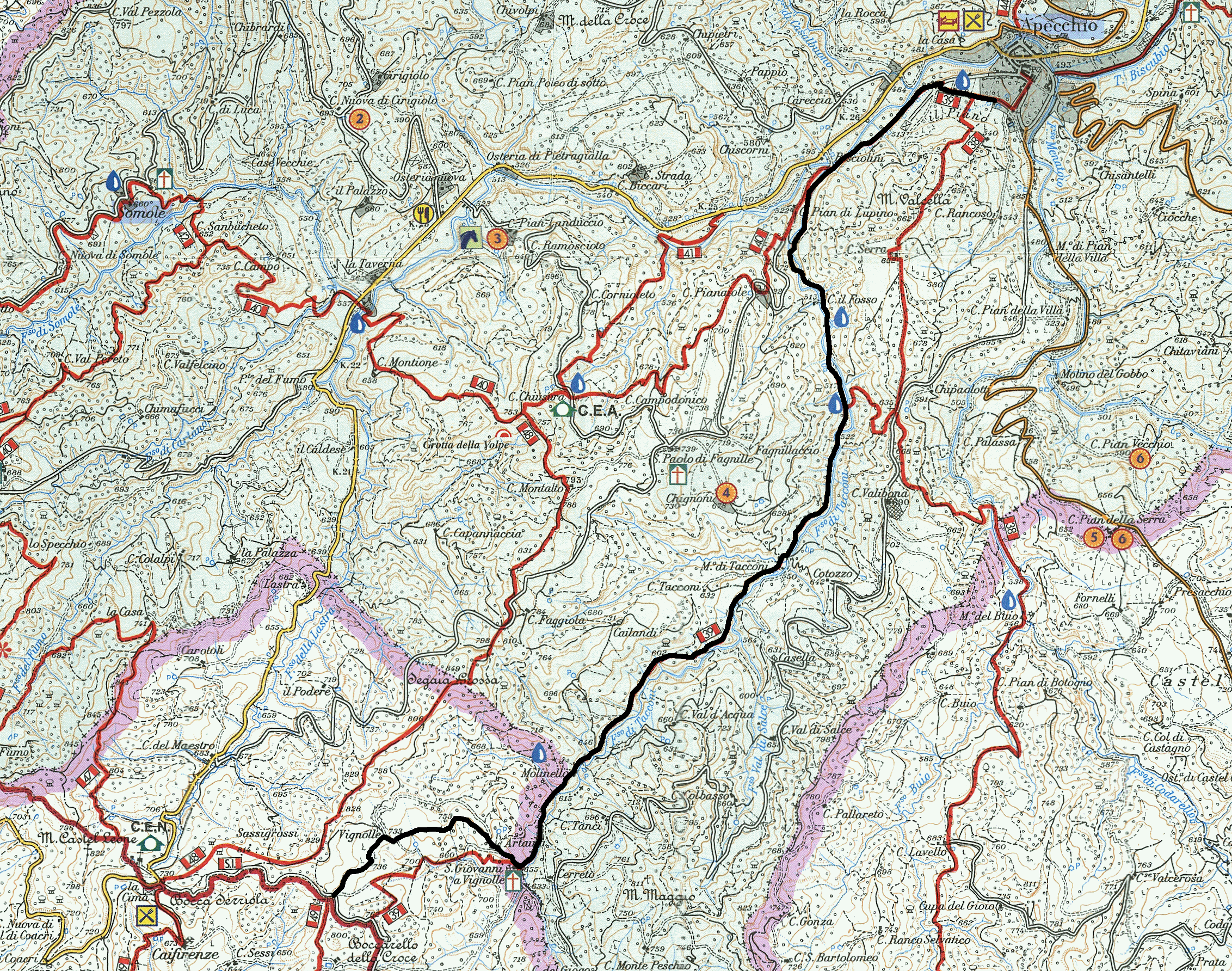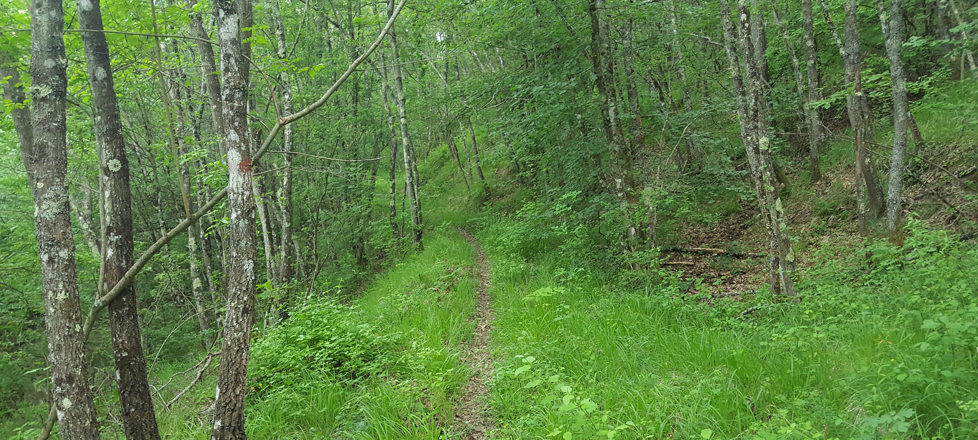 Si raggiunge, non senza fatica e trovando qualche sporadico segno sugli alberi, la grande casa colonica (abbandonata) denominata Artaina, da cui si può raggiungere il crinale utilizzando una vecchia strada sbrecciata (il sentiero secondo la mappa passerebbe tra campi e boschi ma è veramente impossibile da trovare), da imboccare verso sinistra e facendo attenzione ai due successivi bivi, in cui bisogna svoltare la prima volta ancora a sinistra e la seconda volta a destra.
