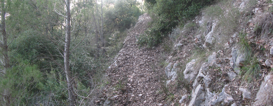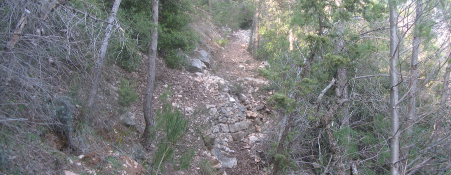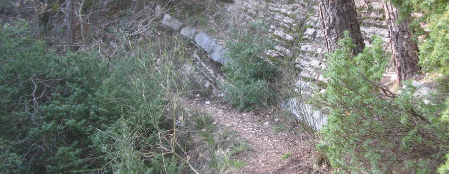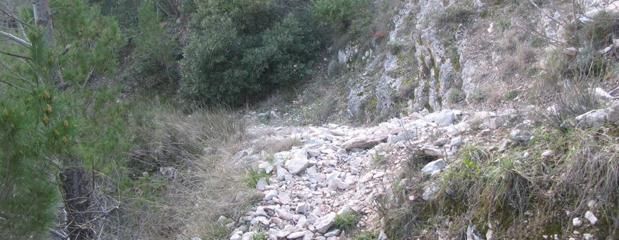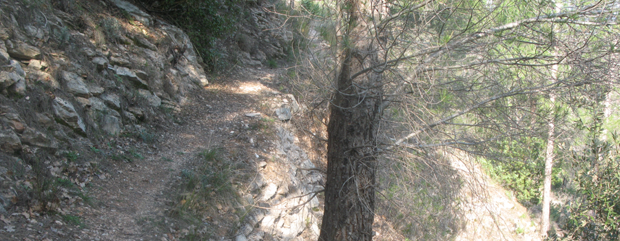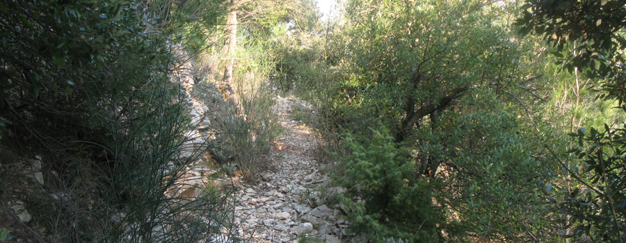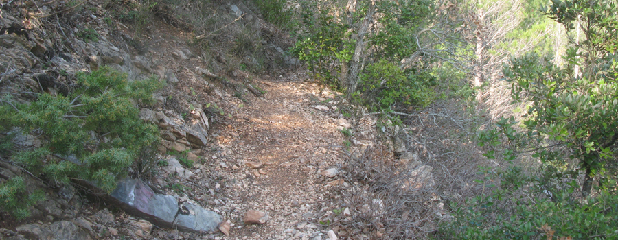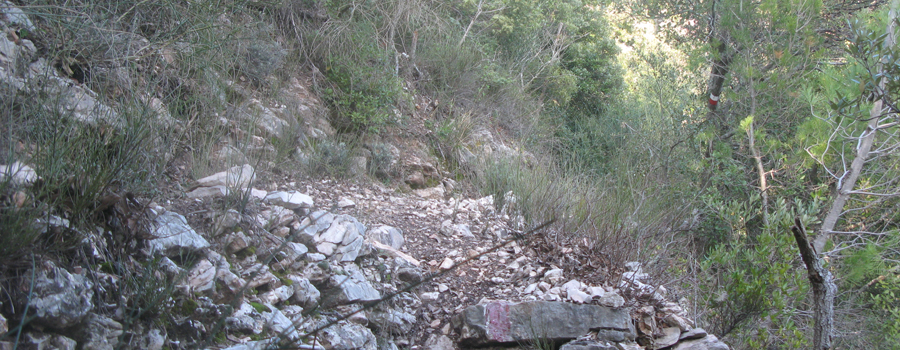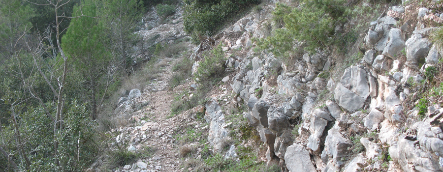 Le pendenze sono da subito molto importanti, mentre il percorso sale sul pietroso versante compiendo diverse svolte piuttosto ravvicinate tra loro. La segnatura è abbastanza buona, risistemata pochi anni fa, ed è necessario seguirla con attenzione, in particolare in prossimità di un bivio da dove una falsa traccia, evidente ma errata, condurrebbe con una svolta a sinistra in una zona impervia.