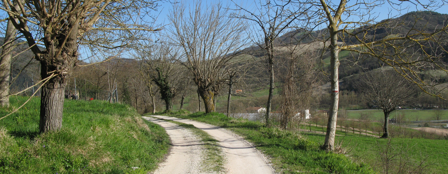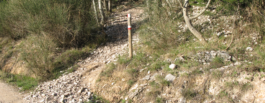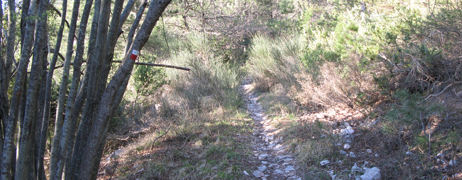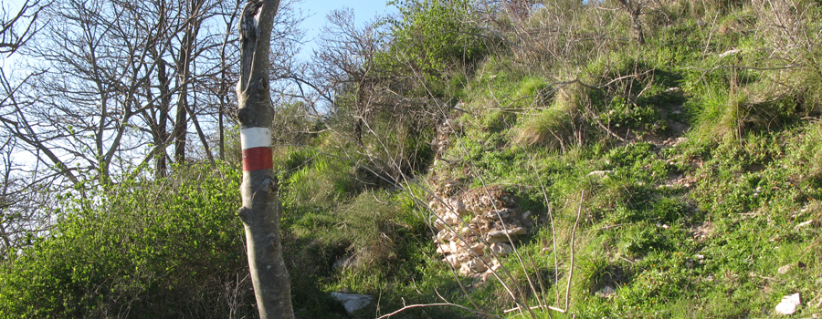 Il primo tratto è su strada asfaltata, la si percorre per pochi metri fino ad una svolta a destra (qui il fondo diventa sterrato), quindi si segue la nuova via, si oltrepassano delle abitazioni e si raggiunge un nuovo incrocio, dove si svolta a sinistra ancora su asfalto e si giunge infine ad un piazzale, nei pressi di una villetta, in cui la strada termina e si imbocca il sentiero vero e proprio (fare attenzione al segno su albero, è recente ma posto in una posizione un po’ nascosta, non facilissimo da individuare).