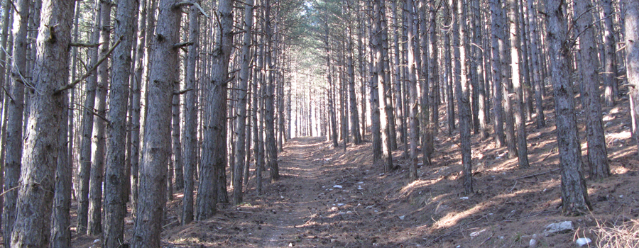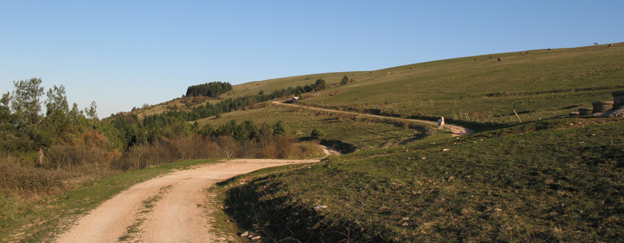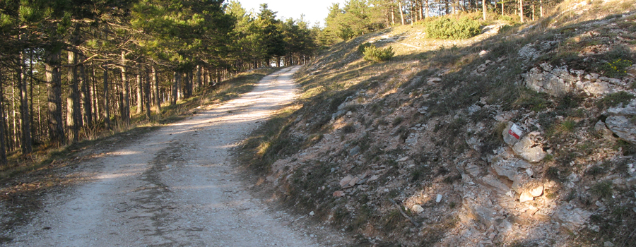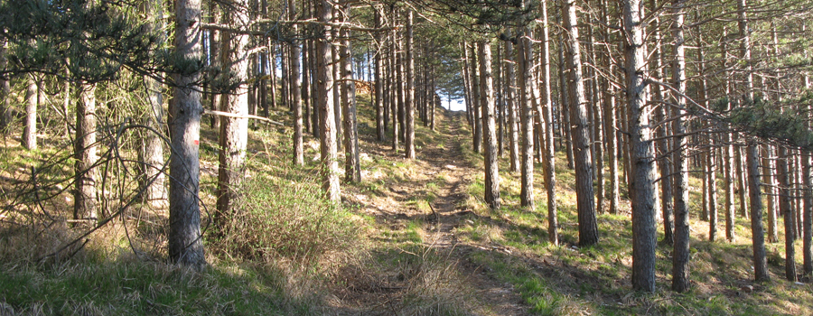 Superato il borgo si incontra nuovamente la strada, nel punto in cui da destra si innesta anche il sentiero 441A, che si taglia nei pressi di un tornante per riprendere a salire all’interno di una piacevole e fresca pineta ad alto fusto, che accompagna il tracciato fino all’uscita sui prati sommitali, nei pressi della cima del Monte Bregno, dove si inizia a seguire la strada sterrata che circonda ad anello la vetta del Pietralata.