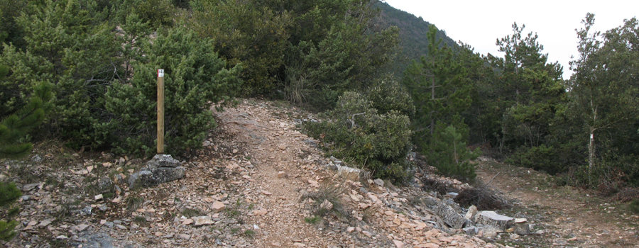 Al termine della risalita è posto il bivio con il sentiero 446A che scende verso il Rifugio del Furlo, mentre il 446 prosegue svoltando a sinistra alla volta della vetta.