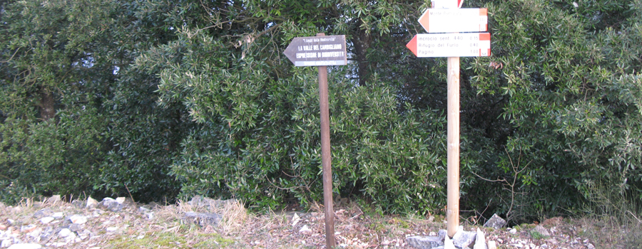 Un primo e lungo tratto, infatti, si sviluppa completamente lungo la sterrata che conduce al Rifugio del Furlo, che sale con pendenza regolare e non certo proibitiva disegnando ampi tornanti, abbandonata solo per brevi tratti su comodo sentierino immerso nella vegetazione a basso fusto. Salendo si può ammirare, sulla sinistra, un bel panorama sulla valle sottostante, con il Candigliano che serpeggia formando numerose anse perfettamente integrato nel paesaggio rurale e, sullo sfondo, le imponenti vette della catena appenninica.