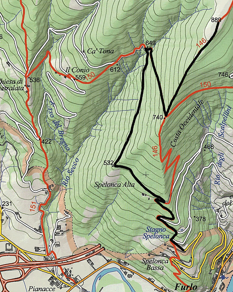 Il sentiero 446 rappresenta la via più comoda per raggiungere la vetta del Monte Pietralata (una delle due cime principali della Riserva Naturale Statale Gola del Furlo), partendo dalla località detta “Spelonca Bassa”, posta a 350m di altitudine sulla strada asfaltata che conduce dal paese di Furlo fino al rifugio omonimo. Il percorso era originariamente contrassegnato dal numero 146 ed il suo tracciato si sviluppava partendo da molto più in basso, in corrispondenza della consolare Flaminia, ma in seguito al lavoro di risistemazione e risegnatura eseguito recentemente su tutta l’area, e considerate le pessime condizioni della parte bassa la cui traccia era stata quasi completamente inghiottita dalla vegetazione, si è deciso di modificarne la partenza optando per una soluzione più agevole.