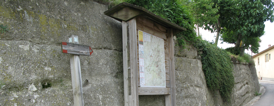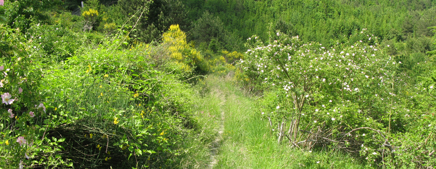 Si parte in una viuzza asfaltata, che termina dopo pochi metri lasciando spazio ad una piccola traccia che si inoltra nei campi, inizialmente circondata da recinzioni e successivamente da una piacevole vegetazione arbustiva che accompagna il percorso fino all'entrata nel bosco, dopo aver percorso diverse centinaia di metri in leggera salita.