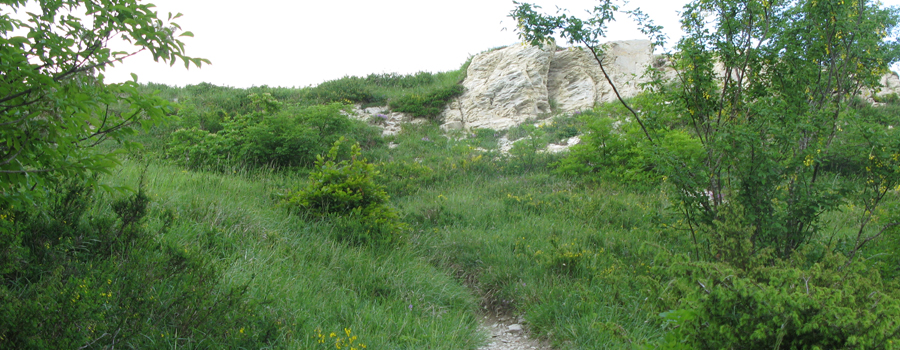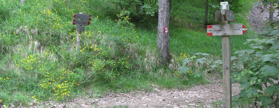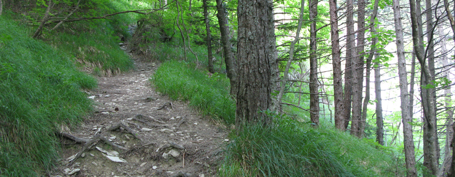 Il sentierino si inerpica quindi in maniera decisa risalendo il versante e compiendo piccole e repentine svolte, in un ambiente sempre piuttosto uniforme e caratterizzato da una certa umidità (attenzione alla possibilità di scivolare), anche nelle stagioni estive.