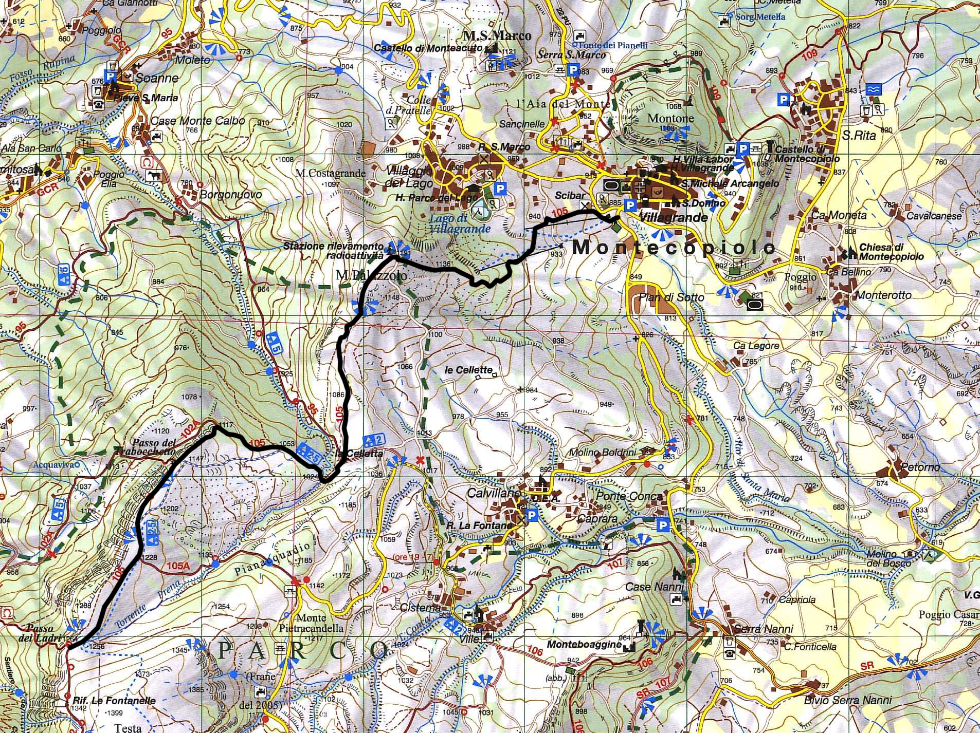Il sentiero 105 del comprensorio del Monte Carpegna è una interessante via, di difficoltà media, che conduce da Villagrande di Montecopiolo al Passo dei Trabocchetto, transitando lungo il percorso per la panoramica vetta del Monte Palazzolo.