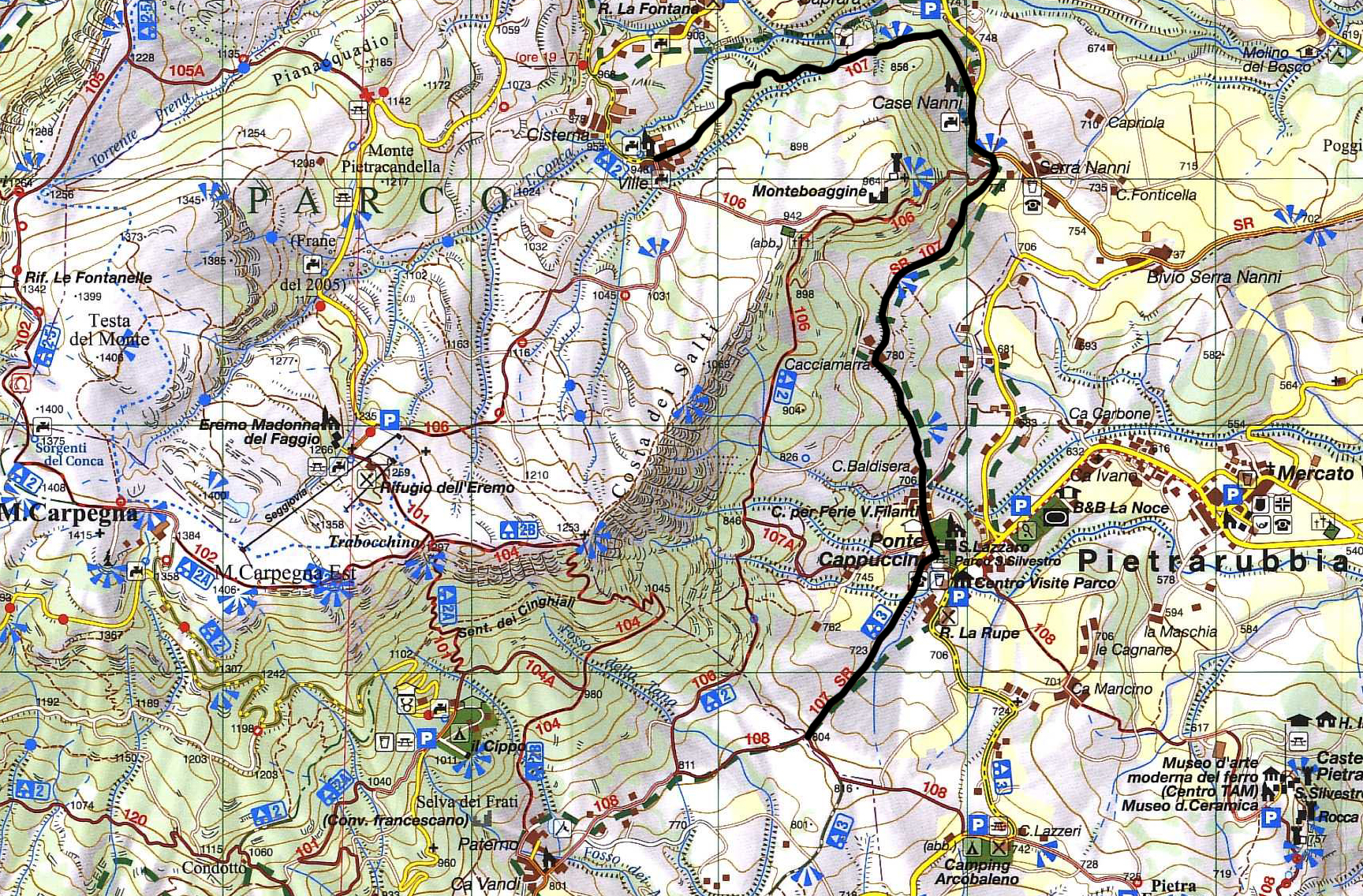 Il sentiero 107 del Monte Carpegna è un lungo itinerario di difficoltà medio/bassa, che collega il sentiero 108 con la frazione “Le Ville”, attraversando Ponte Cappuccini e Case Nanni.