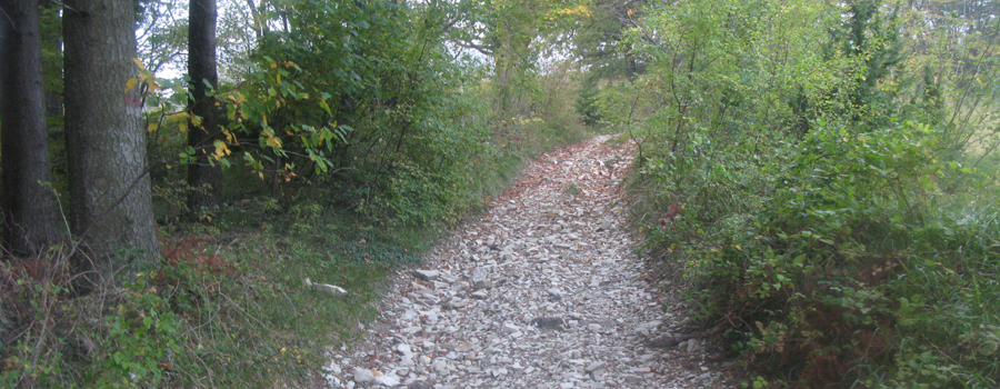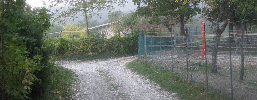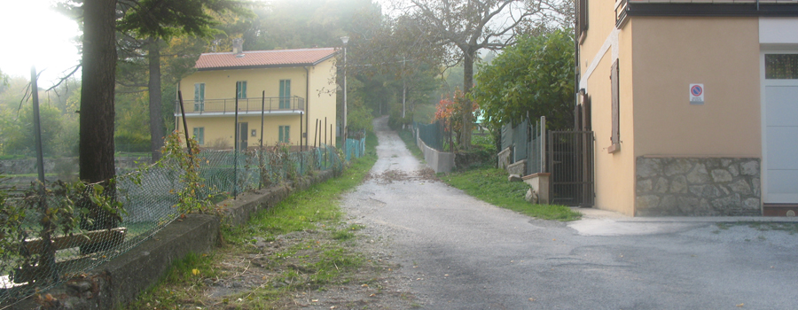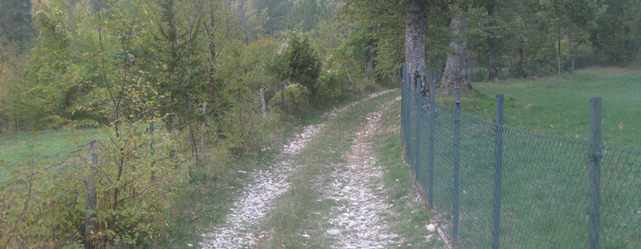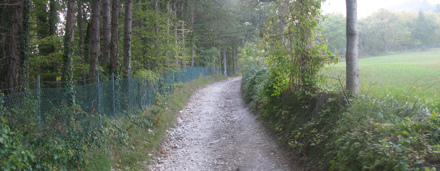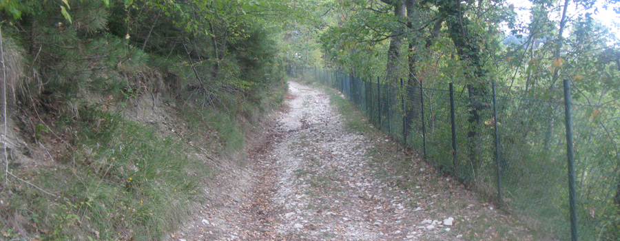 In breve tempo si giunge ad un bivio dove si svolta a sinistra (attenzione, non è segnalato e la direzione corretta non è intuitiva), si attraversa un piccolo fosso e si prosegue lungo la sbrecciata, lasciandosi sulla destra un’ampia proprietà privata, che viene aggirata completamente dalla strada costeggiando la recinzione che rimane sulla destra.