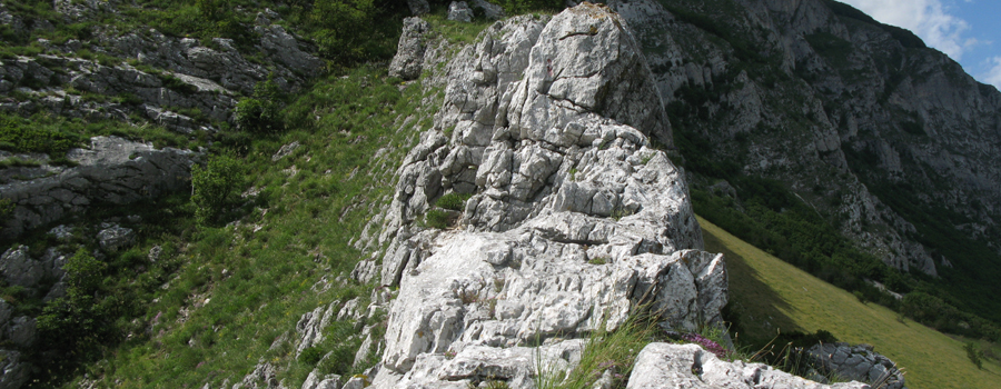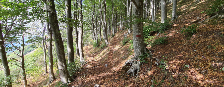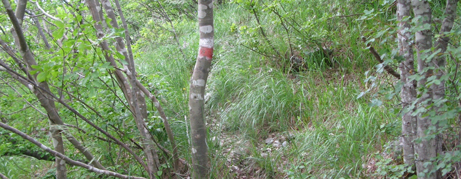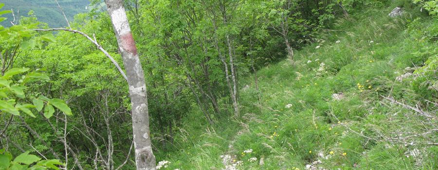 La prima parte della salita è relativamente semplice, si tratta di 1,3km in discreta salita che permettono di raggiungere l’attacco della maestosa cresta (che già si staglia col suo profilo inequivocabile sullo sfondo), alla quota di 660 metri di altitudine. In questo punto si incrocia la variante (denominata 29bis) che sale da Isola Fossara e si svolta a sinistra sulla cresta, iniziando l’ascesa vera e propria. Il cambio di ritmo è subito notevolissimo, la salita si fa impegnativa e l’ambiente circostante inizia a mutare, con la traccia che sparisce e le rocce sostituiscono gradualmente i prati, fino a ritrovarsi a seguire il filo di cresta (è presente una segnaletica sporadica e piuttosto datata, ma l’orientamento non è un grosso problema in quanto vi è un’unica possibile direzione da percorrere) che si restringe sempre più mentre si guadagna quota e, su entrambi i lati, aumenta l’esposizione...