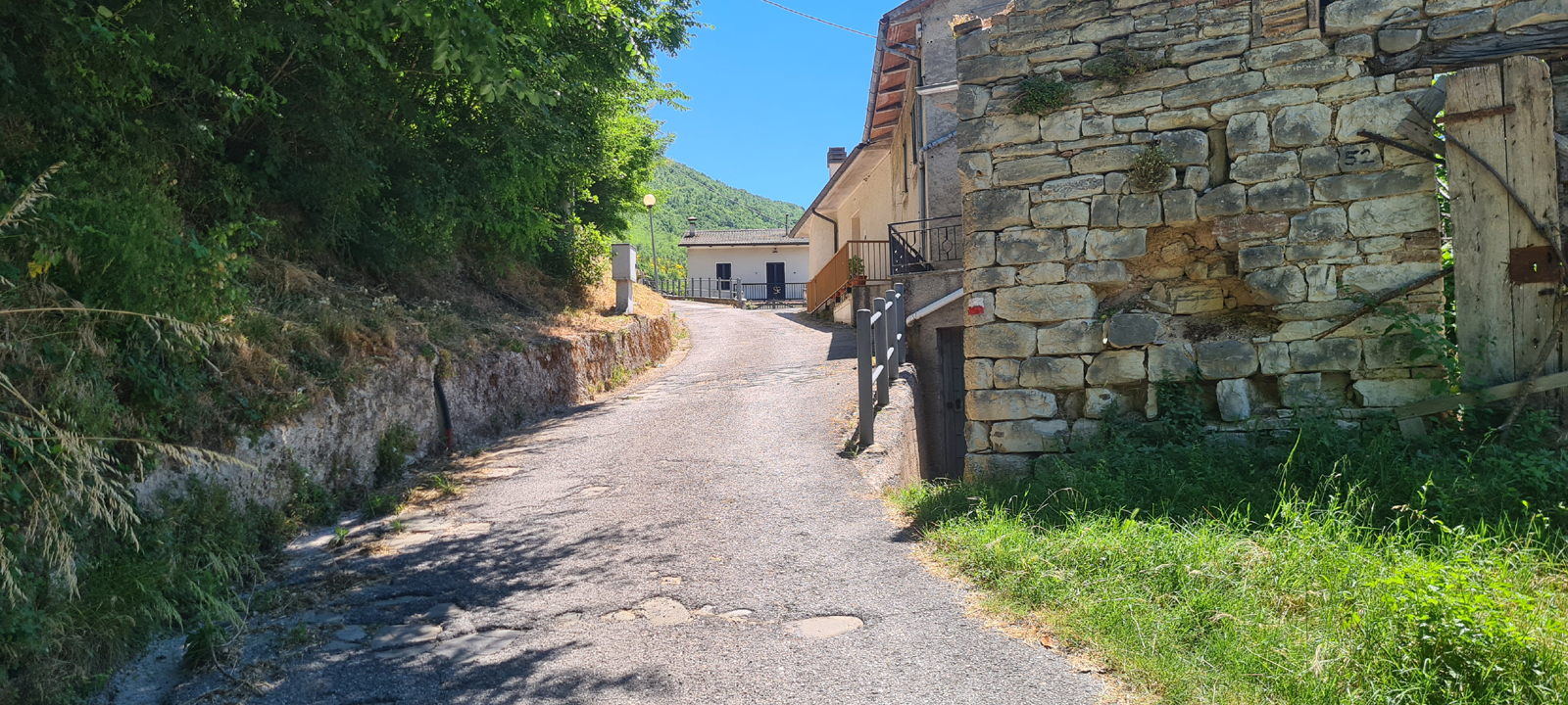 Il primo tratto si svolge all’interno del paese, su strada asfaltata, con ai lati le caratteristiche abitazioni a fare da cornice. Già da subito la pendenza si fa sentire, e prima ancora di aver abbandonato l’abitato si saranno già percorsi più di 100 metri di dislivello...