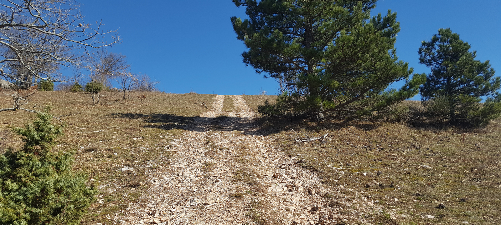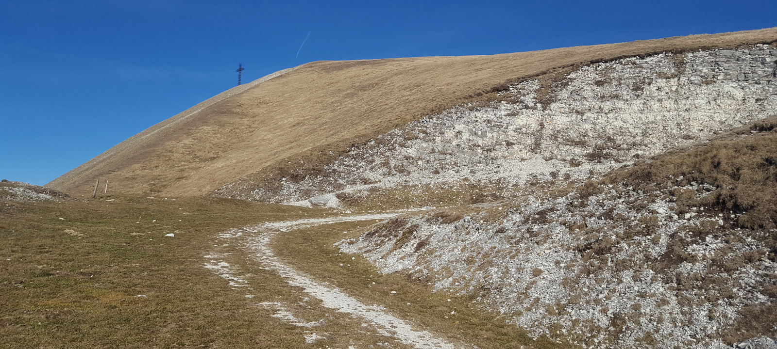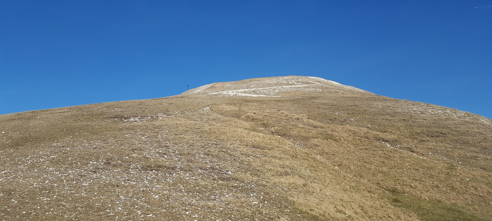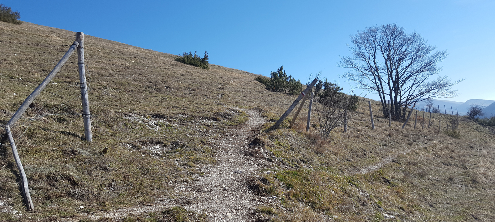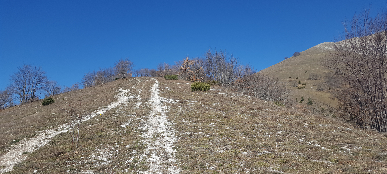Superata una doppia svolta, tratto con notevole pendenza, si incrocia dapprima il sentiero 54a che sale da destra, quindi si giunge ad un ampio prato con abbeveratoio (purtroppo spesso in secca), dove termina il tratto su strada. Da questo punto, volgendosi a sinistra, è già possibile intravedere tutto il percorso da affrontare, una lunga e ripida cresta che conduce fin sulla vetta. Inizialmente la traccia è ben evidente e si dirige verso un primo rilievo che andrà aggirato lasciandoselo sulla sinistra (unico punto di tutto il percorso dove occorre fare attenzione), ritrovandosi poi su un ampio e ripido pascolo che si estende ininterrotto fino alla cima. In questo tratto si supera un secondo abbeveratoio (anche in questo non si trova mai acqua) e si risale verso un piccolo agglomerato di faggi, isolato all’interno del pascolo.