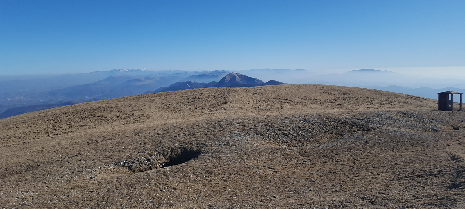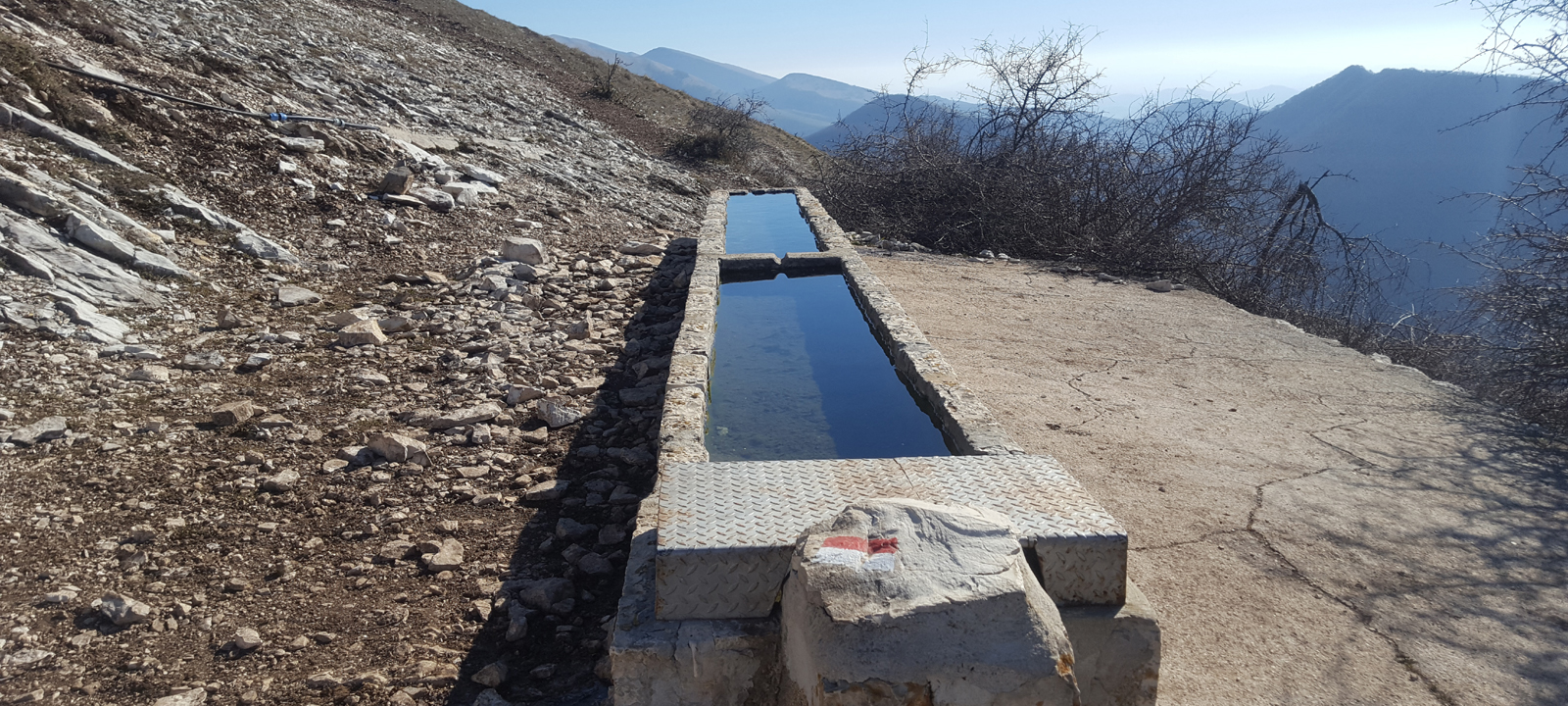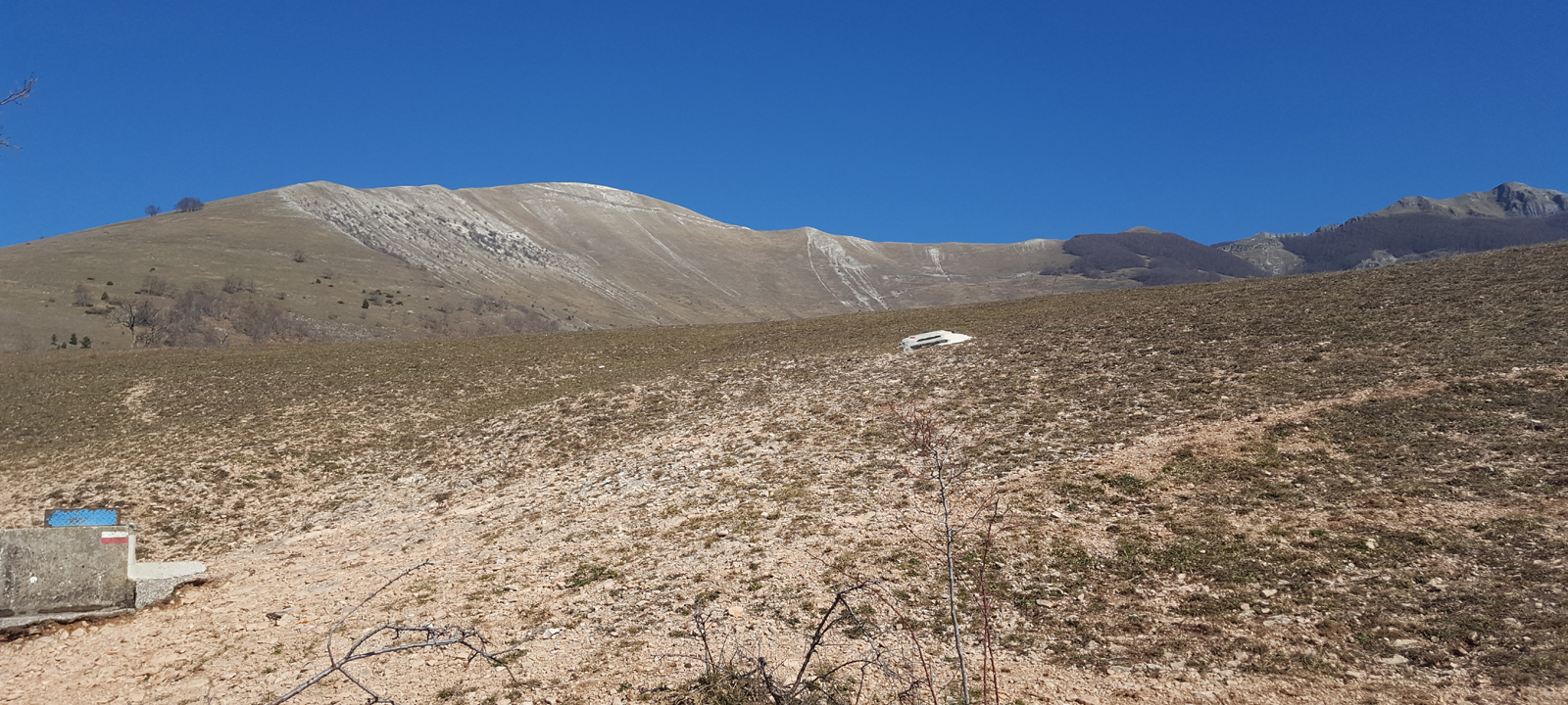 Dopo circa mezz’ora si perviene ad un terzo abbeveratoio che, neanche a dirlo, è ovviamente in secca (essendo il percorso tutto in ambiente scoperto un po’ d’acqua non sarebbe dispiaciuta, ma tant’è…) e, salendo ancora per altri 150 metri, si giunge infine ad incrociare il grande tornante della vecchia strada, oramai in totale disuso, che conduce fin sotto la vetta (il perché della creazione di questa “infrastruttura” non è semplice da capire, di fatto serve solo a deturpare il fantastico paesaggio, non essendo praticamente mai percorsa da nessuno e risultando ridotta in condizioni pessime a causa dell’incuria).