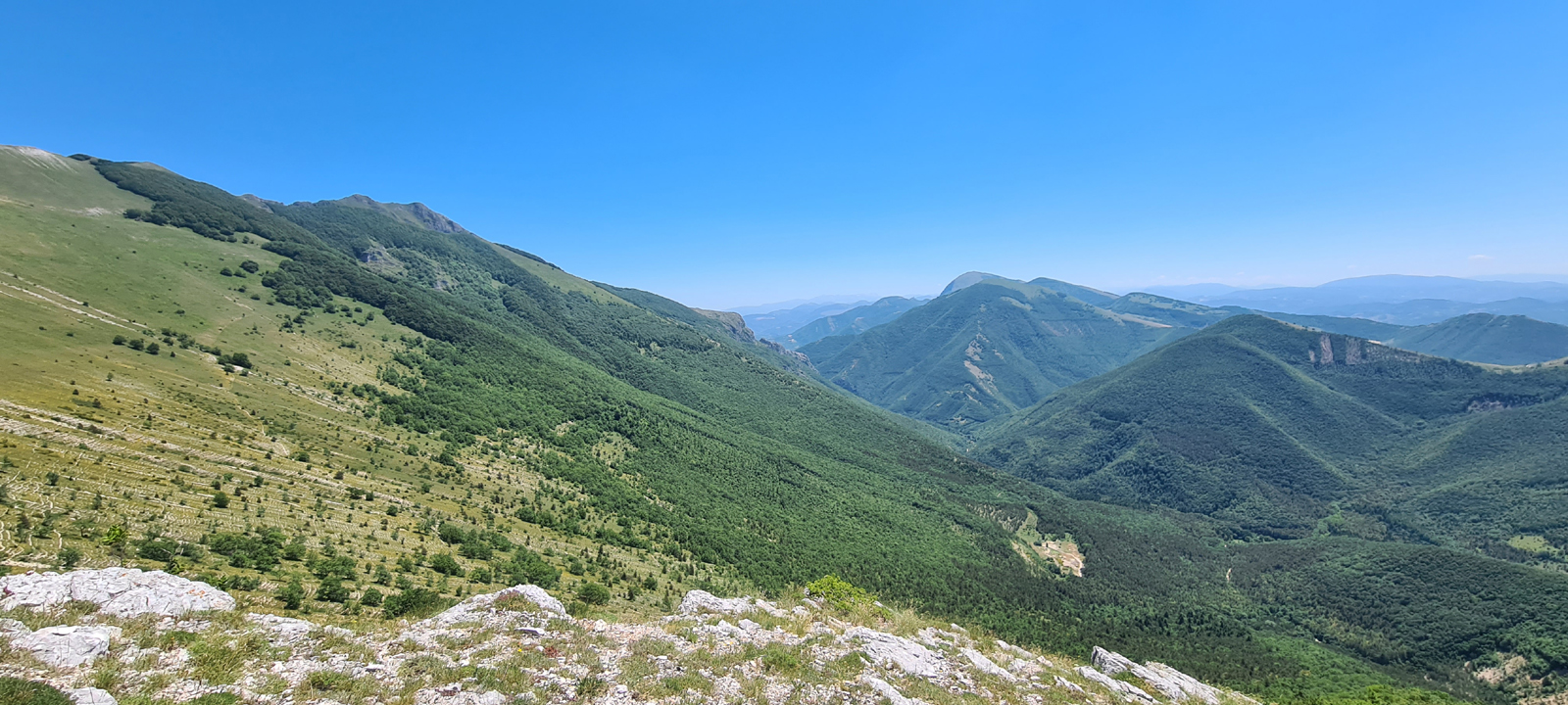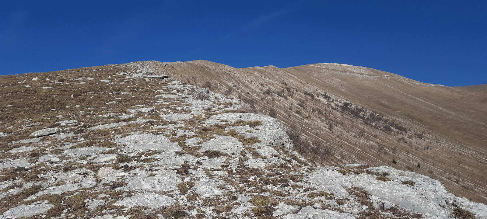 Da questo punto si affronta un facile traverso, verso destra, che conduce in pochi minuti al crinale, proprio a lato del grande anfiteatro detto “Valle delle Patate”, che si estende a perdita d’occhio fino alla Balza degli Spicchi ed al selvaggio Corno del Catria, con viste panoramiche davvero notevoli. Non è presente segnatura di nessun tipo, ma è praticamente impossibile sbagliarsi, infatti bisogna semplicemente risalire l’interminabile cresta, niente di più facile, almeno dal punto di vista dell’orientamento… (la pendenza invece si fa notevolmente sentire sulle gambe…).