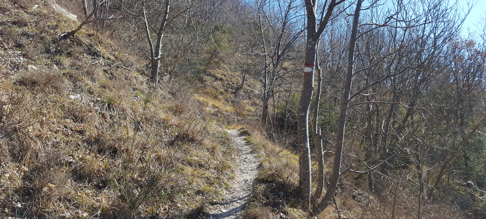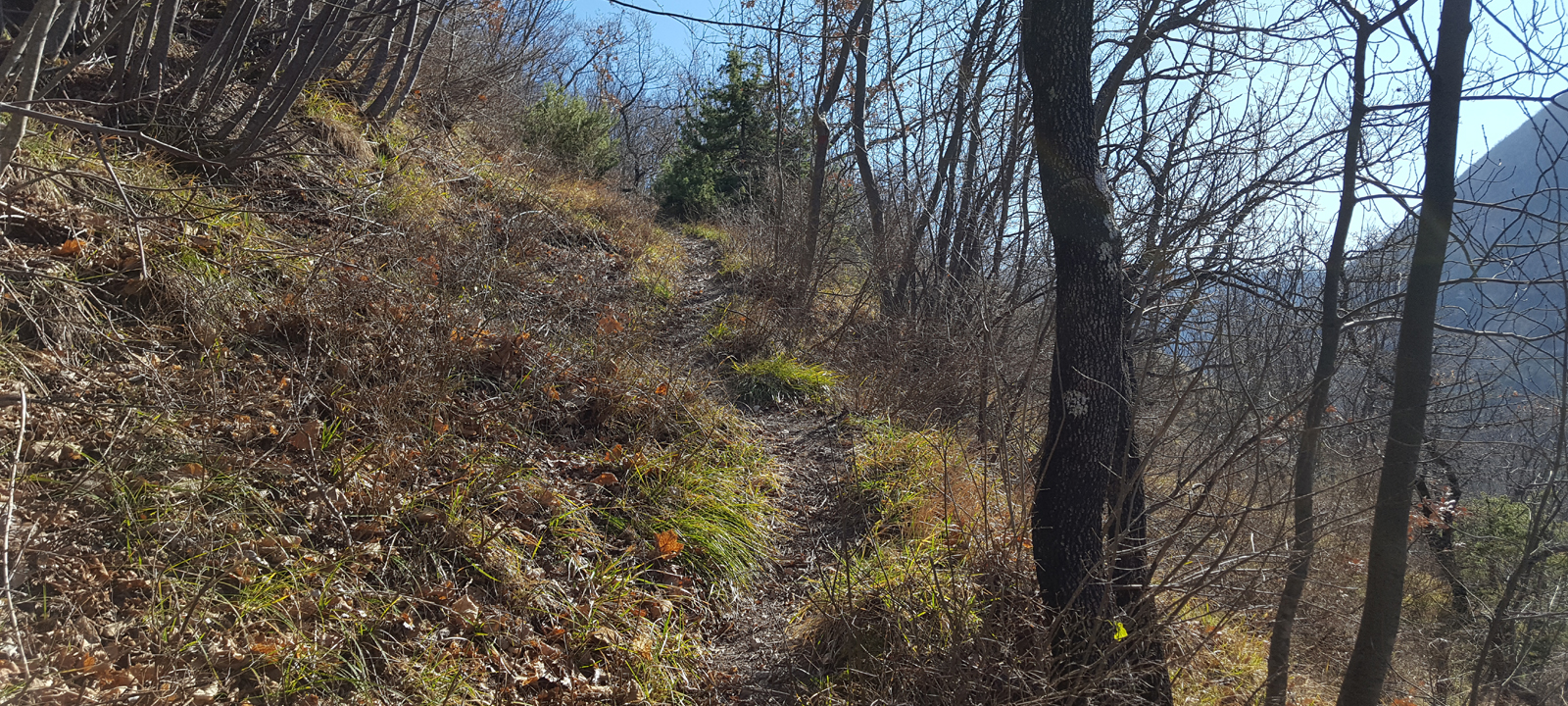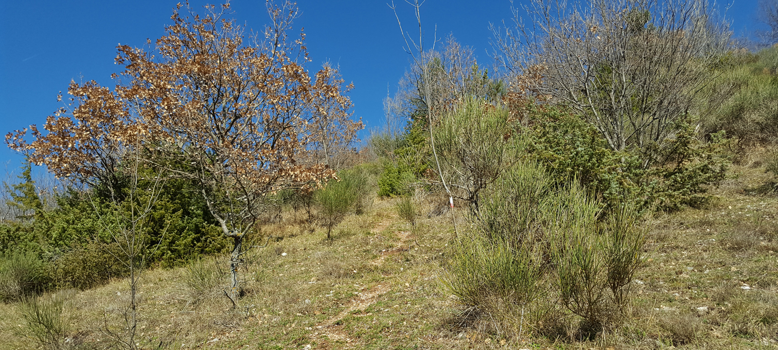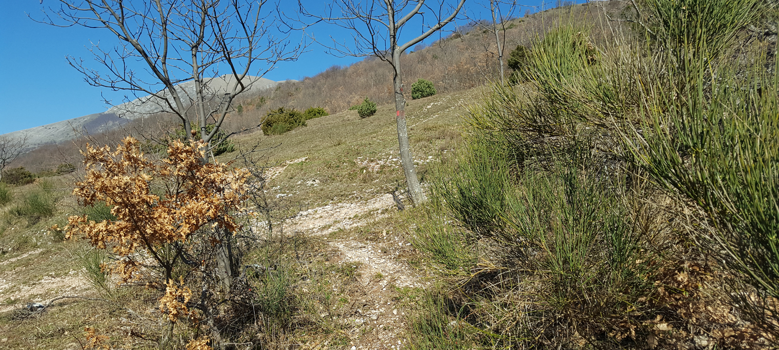 Il sentiero è tutto in salita se si eccettua un brevissimo tratto in contropendenza che si incontra dopo poche centinaia di metri, ed in breve tempo si sbuca sui prati dove la traccia continua a guadagnare quota circondata da diversi cespugli di ginestra.