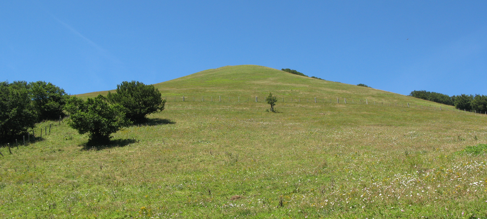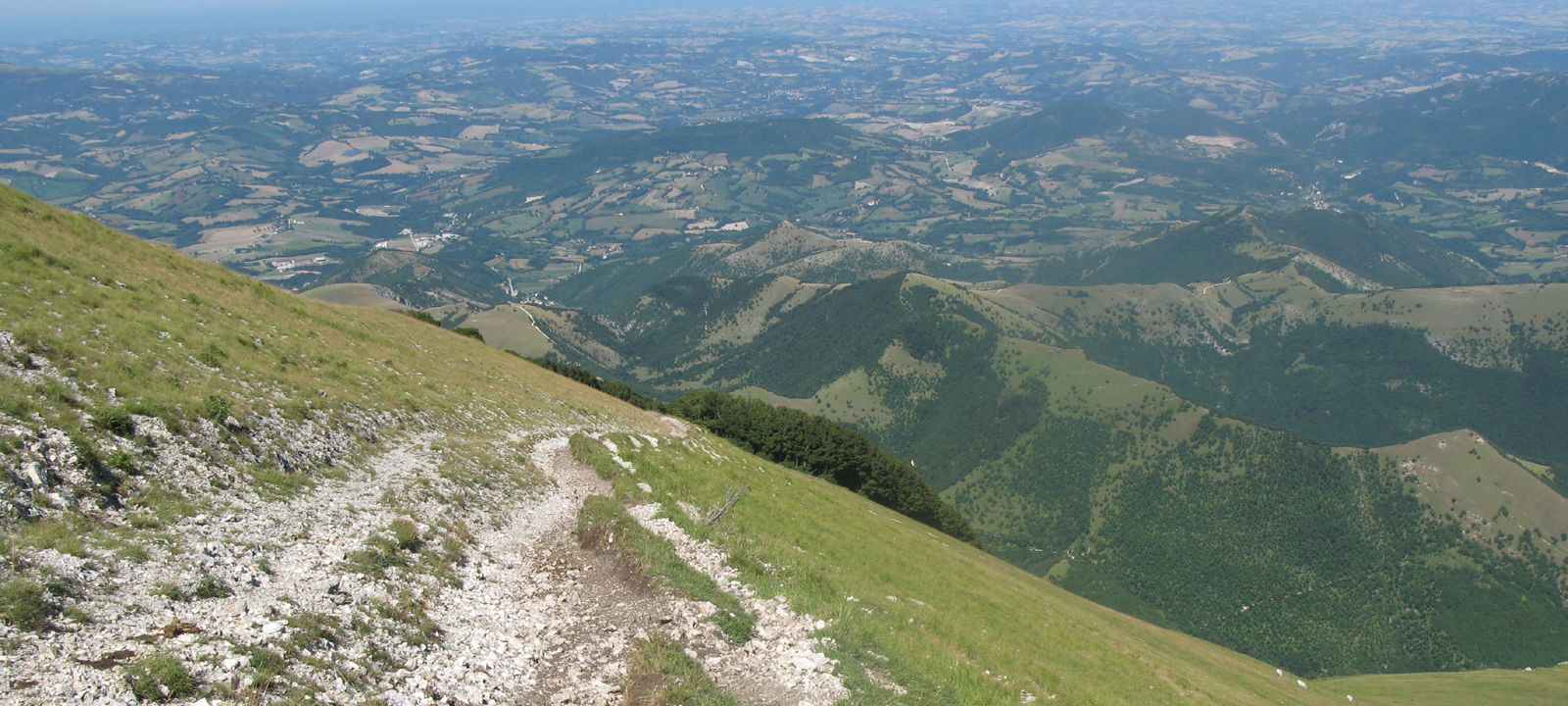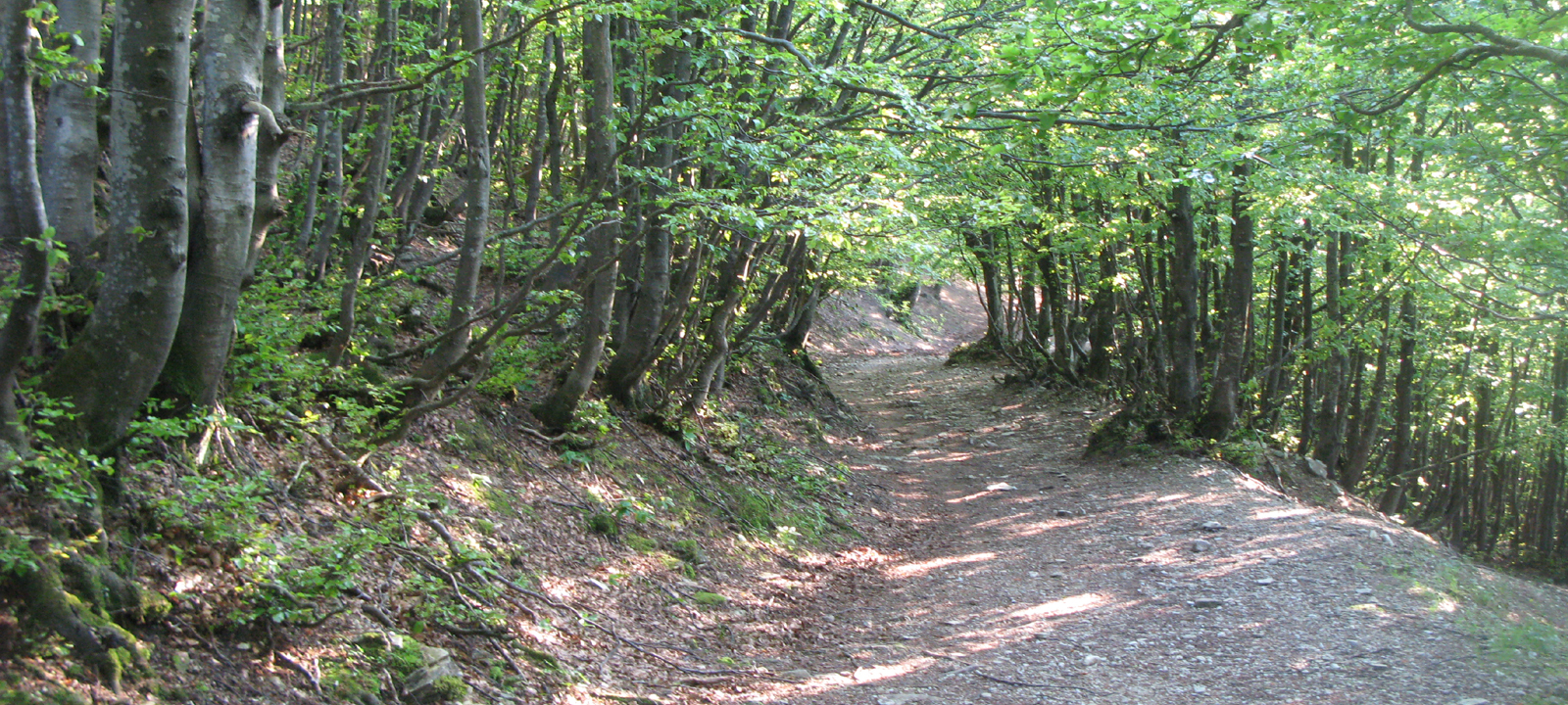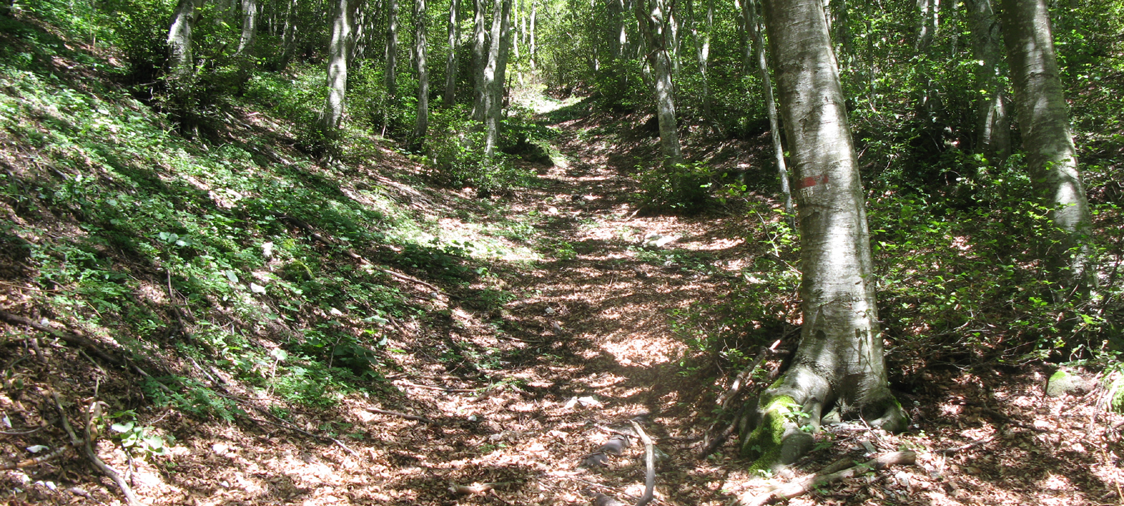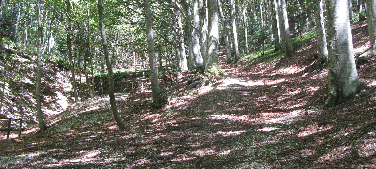 Al termine della parte esposta la cresta diventa più dolce, proseguendo su terreno piacevolmente ondulato tra i verdi boschi ammirabili sulla destra e la spettacolare Valle delle Patate sulla sinistra, un grande anfiteatro semicircolare che si estende a perdita d'occhio fino alla strada provinciale, quasi 1000 metri più sotto...