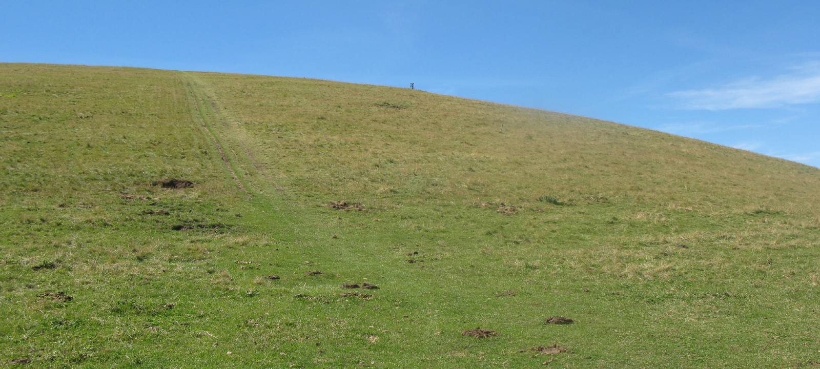 E' in questo punto che si incrocia, proveniente da sinistra, il sentiero 53 che s'inerpica appunto ai margini della Valle delle Patate. Superate alcune "gobbette", dalla pendenza comunque accettabile, si incrocia la strada sbrecciata che conduce in vetta, costruita non si sa bene per quale recondito motivo, la quale risulta essere più uno sfregio all'incontaminato paesaggio che un'opera dall'effettiva utilità (ci sono passato decine e decine di volte, non ci si trova mai nessuno anche perchè ha un fondo stradale disastroso e lasciato completamente all'abbandono).
