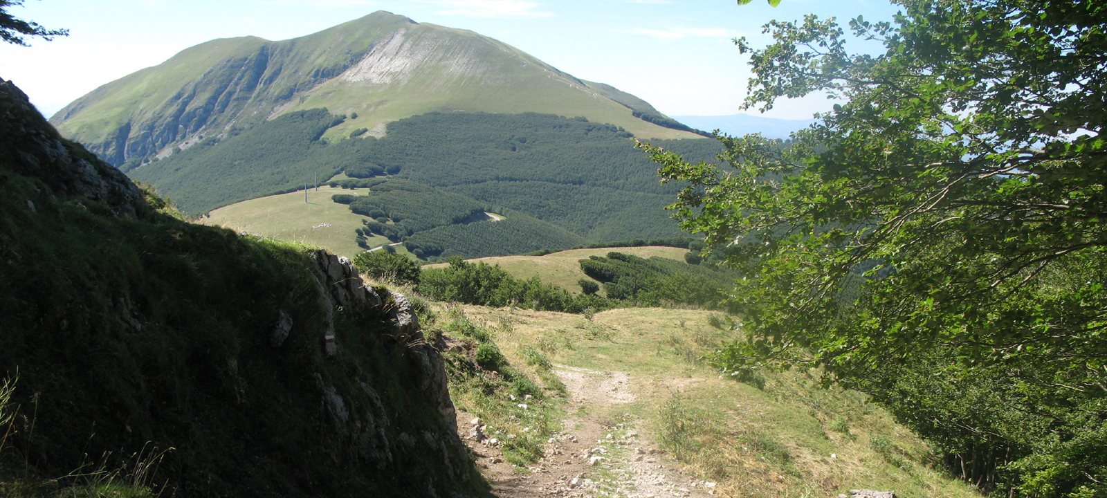 Dal rifugio si segue una traccia che si addentra nel bosco (comune per il primo tratto al sentiero 51), ben segnata e contrassegnata subito da forte pendenza, che conduce in poco tempo ai margini dell'ampio prato detto Pian d'Ortica (quota 1374) da dove, girando a sinistra dopo aver superato una recinzione, si inizia a salire lungo un ripido crinale erboso che conduce alla cima meridionale della Balza degli Spicchi (m. 1524). In questo punto si apre a nord una delle viste più spettacolari che fornisce la zona, con l'imponente sagoma del Catria sullo sfondo e la lunga e accidentata linea di cresta da percorrere per raggiungere la vetta...