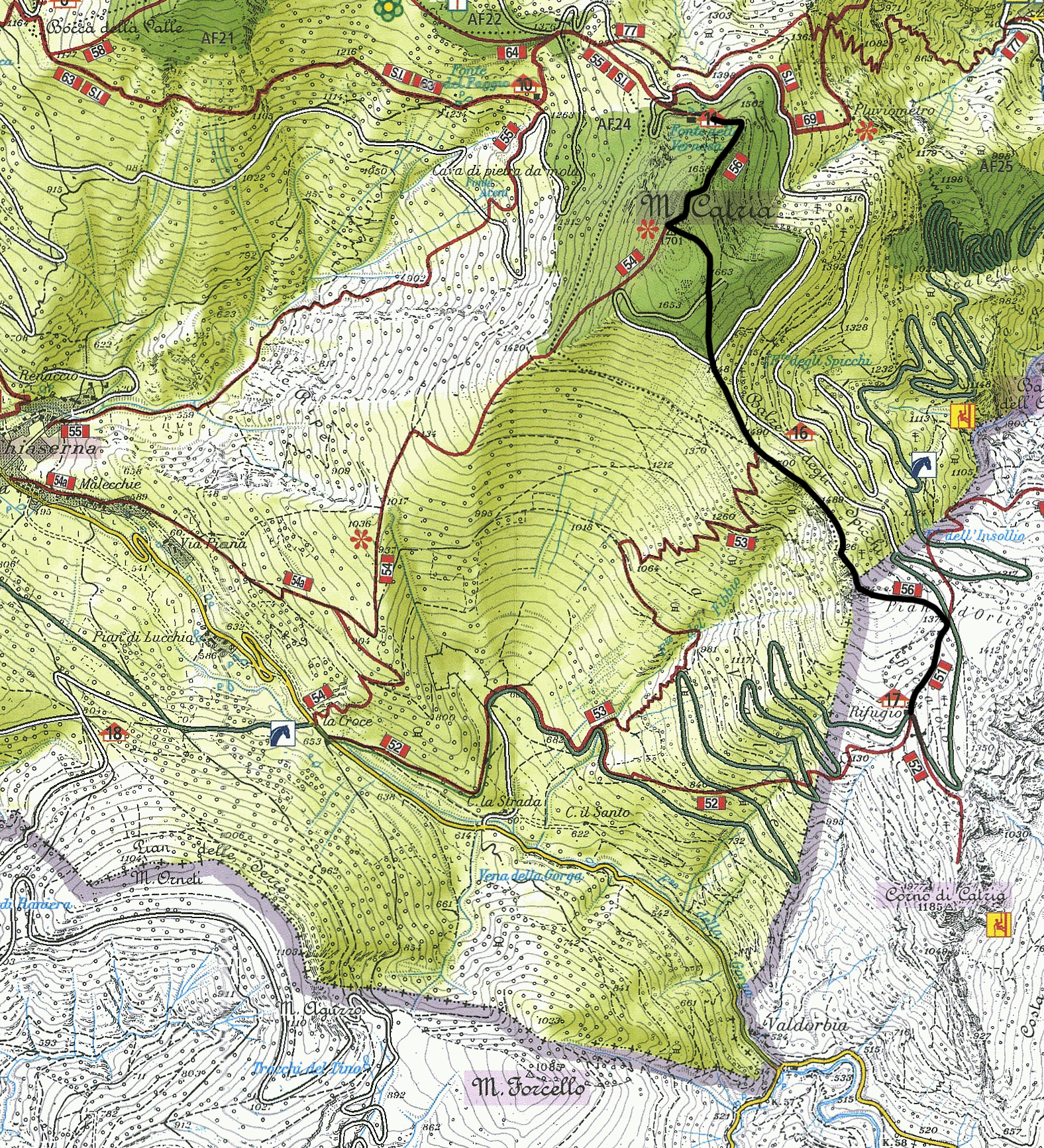 Lasciata la vetta ci si dirige verso nord, affrontando un ripido pratone in discesa ai piedi del quale si trova l'inizio dell'evidente traccia, nei pressi di una piccola croce di metallo. Da qui si prosegue su fondo ghiaioso e discretamente ripido, fino a raggiungere un boschetto, dove il sentiero compie una curva decisa a sinistra, oltrepassato il quale si giunge al Rifugio Vernosa (m. 1490), punto d'arrivo del tracciato (qui convergono anche i sentieri 55 e 69).