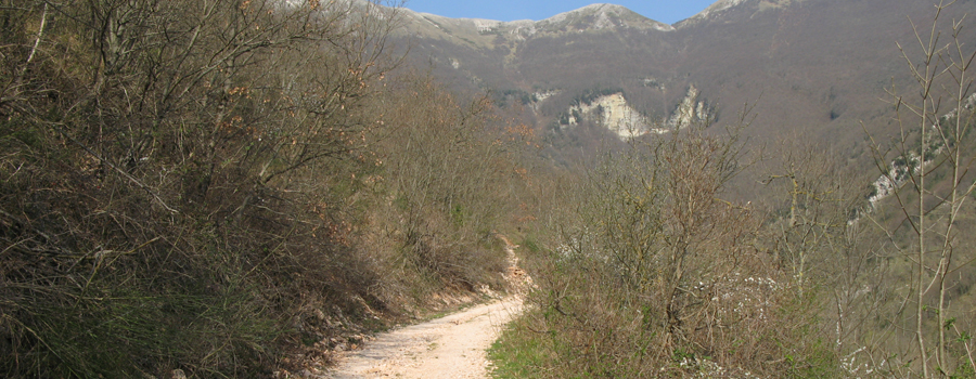Il punto di partenza si trova presso il cimitero di Cantiano, (presso cui transita anche il Sentiero Italia, contrassegnato in questo tratto dai numeri 67 e 68) ed occorre subito fare attenzione in quanto i lavori di ampliamento dello stesso hanno eliminato la prima parte della strada, che parte ora dal lato opposto all’ingresso principale. Una volta trovata la via corretta, la si segue per diverse centinaia di metri, con di fronte l’imponente valle a forma di conca nella quale ci si inoltra… In questa prima parte non è presente la benché minima segnatura, occorre quindi andare ad intuito (ci sono alcune svolte, da evitare, con vie secondarie laterali) e puntare direttamente verso il Tenetra.
