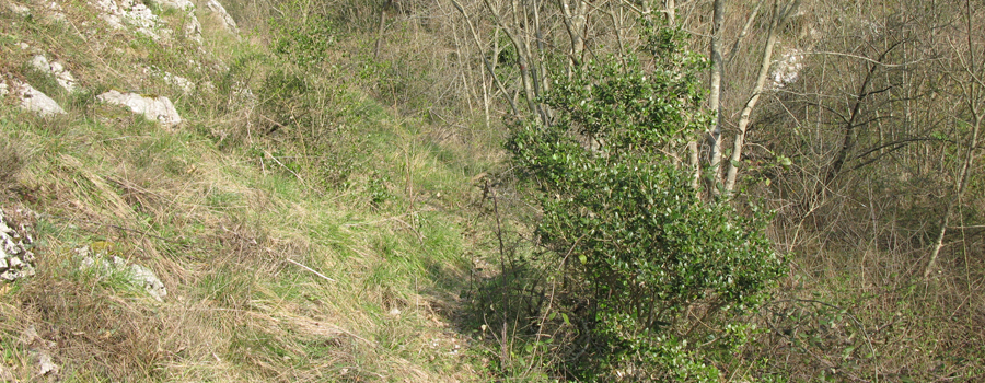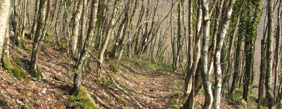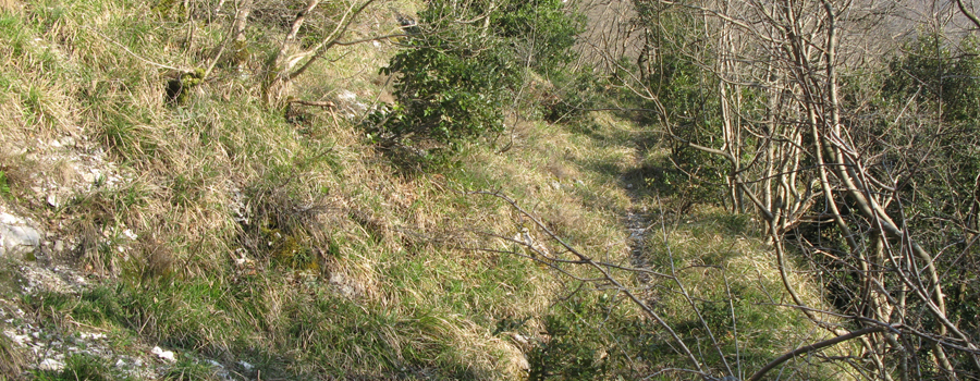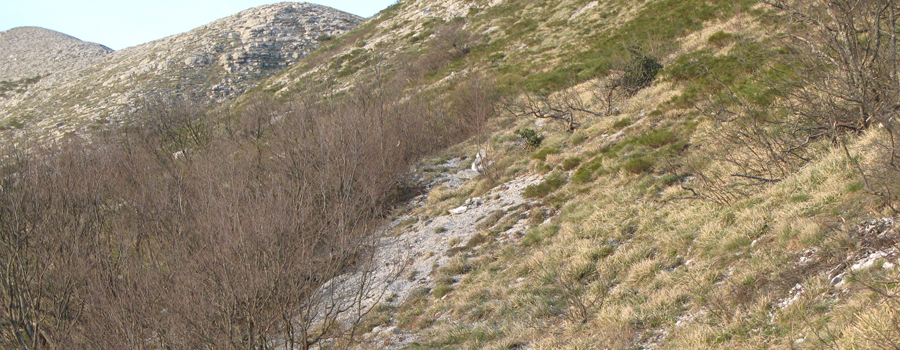 Superata la zona in questione, il sentiero si immerge in un fitto bosco, con la traccia ora molto più netta e le pendenze che si fanno decisamente più marcate, arrivando a toccare dapprima i margini di una zona disboscata (dovuta agli effetti di una grossa valanga staccatasi nell’inverno 2012), quindi dividendosi, con una svolta a destra, dal sentiero Vinci che prosegue sulla sinistra, poi aggirando l’imponente Balza Rossa (spettacolare il traverso sopra la balza stessa, con tratti leggermente esposti ma molto panoramici) ed infine proseguendo a zig-zag nella parte sommitale del bosco, fino ad uscire sui primi prati sommitali, circa 200 metri sotto il filo di cresta.