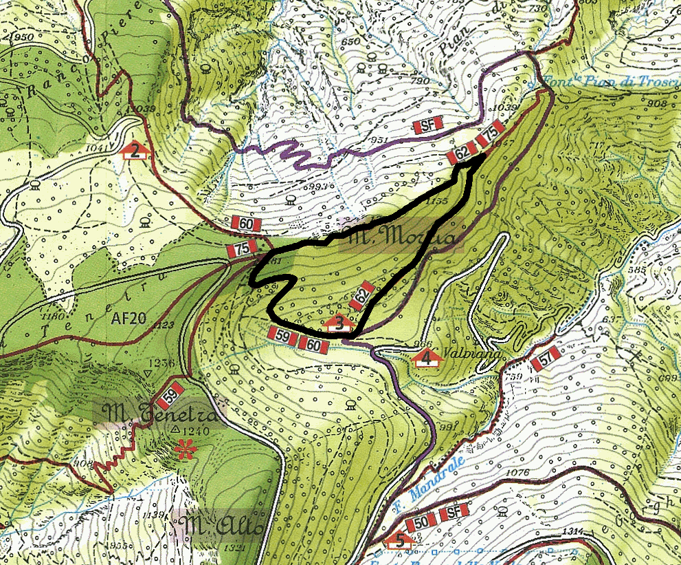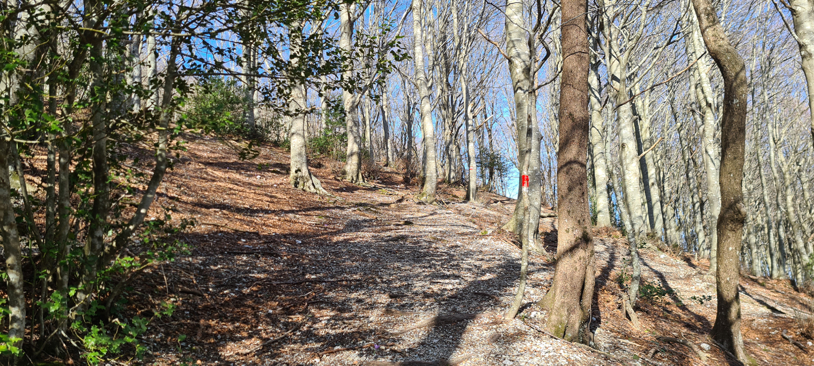 Il bosco inizia a diradarsi quando si incrocia il sentiero 75, che sale da Acquaviva, e con il quale il percorso si fonde, svoltando verso sinistra ed iniziando un tratto comune, che corrisponde alla bella cresta molto panoramica del Monte Morcia.