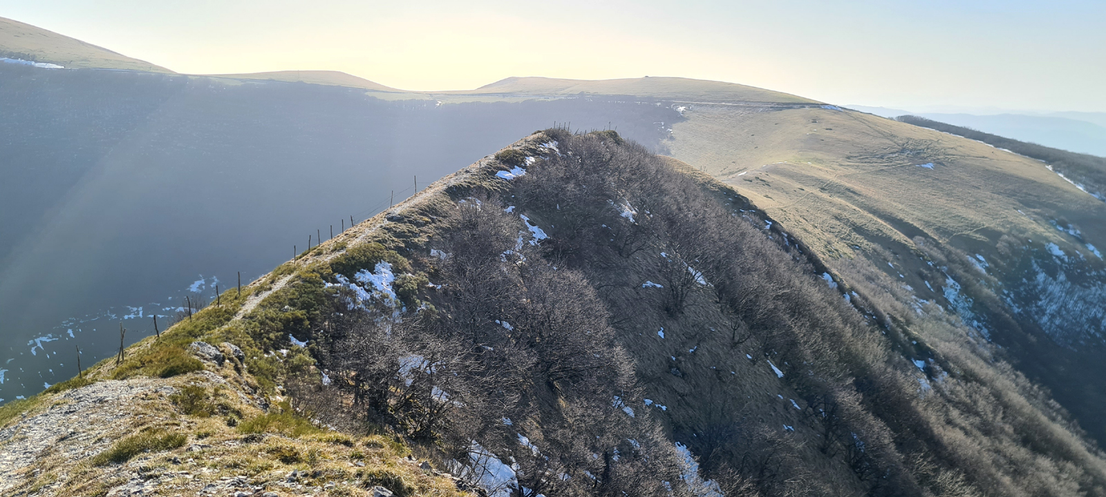 Qui si esce definitivamente dal bosco e si continua a salire verso la vetta, ammirando il vicino ed imponente rilievo del Monte Acuto ed il panorama che si estende a perdita d'occhio in tutte le altre direzioni.