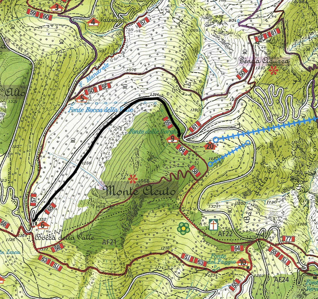 Il sentiero n. 65 (recentemente accorpato ad altri sentieri per formare il lungo percorso n. 260) del comprensorio del Monte Catria è un comodo percorso che congiunge, passando sempre a mezza costa, due dei rifugi presenti alle pendici del Monte Acuto, ovvero la Casetta Mochi e il Rifugio Le Gorghe. Il tracciato si sviluppa interamente all'interno di un fitto bosco di faggio, procedendo parallelamente alla sottostante strada provinciale, che in alcuni tratti si riesce ad intravedere, scrutando attraverso gli alberi.