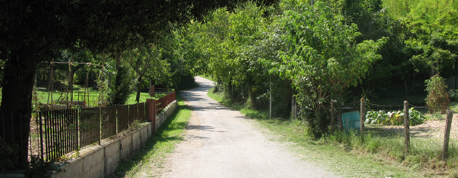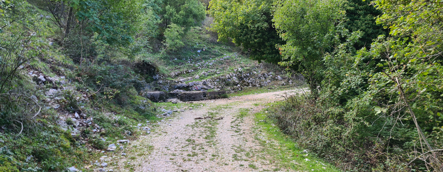 Mentre si sale a fianco dell'acquedotto il fondo stradale passa dall'asfalto al cemento, in un tratto molto duro che sale con pendenze notevoli, per poi mutare ancora di aspetto quando il cemento lascia spazio ad un fondo ghiaioso piuttosto dissestato, con scanalature evidenti dovute alle piogge invernali.