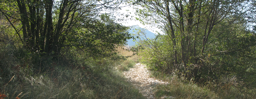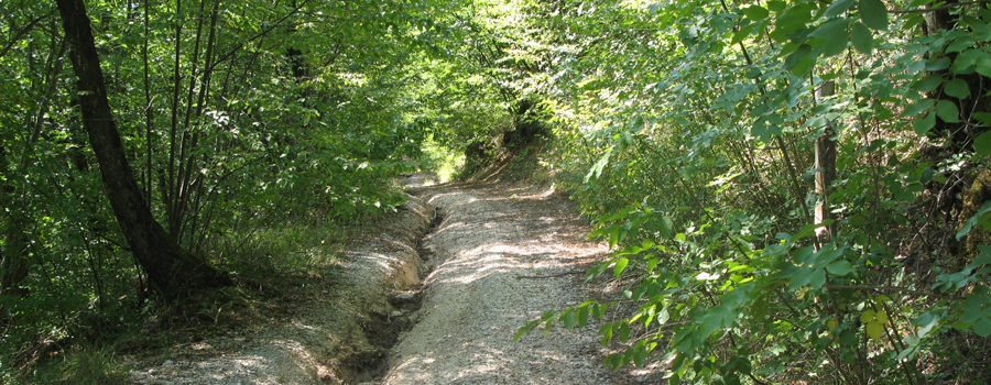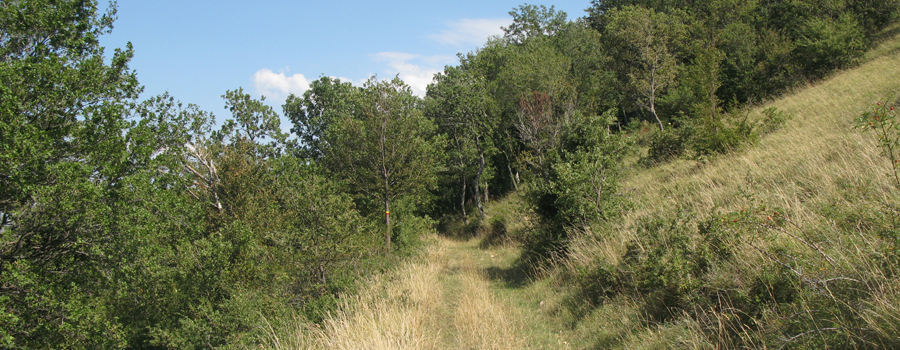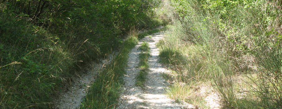 In questo punto il sentiero dovrebbe abbandonare la carreggiata per scendere nel prato sottostante, tuttavia ancora una volta non esiste segnatura e, in questo caso, non esiste più nemmeno la traccia, per cui è conveniente continuare a seguire la strada, in discesa, per un ulteriore mezzo chilometro.