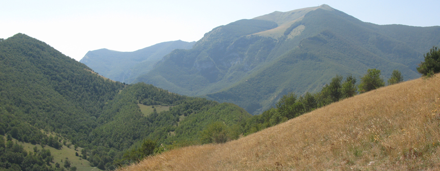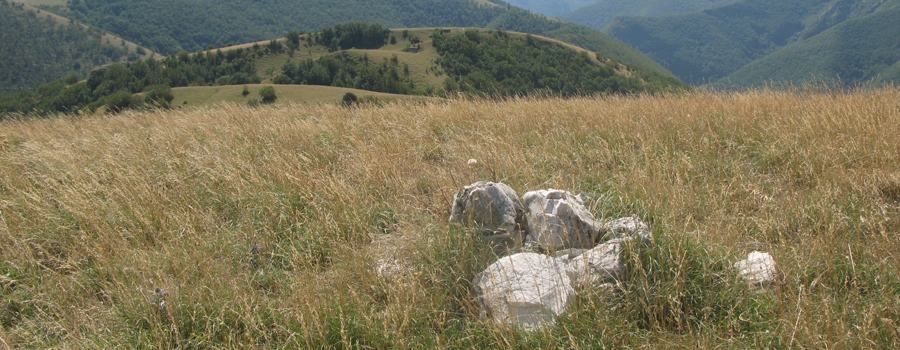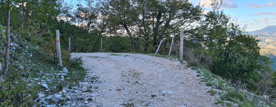 Da qui si discende nuovamente tagliando il prato sull'altro versante e ritrovando nuovamente la strada, che va seguita, proseguendo verso il Catria che si erge maestoso sullo sfondo, per diverse centinaia di metri, fino ad un passaggio piuttosto caratteristico in cui la strada è affiancata da alcune roccette.
