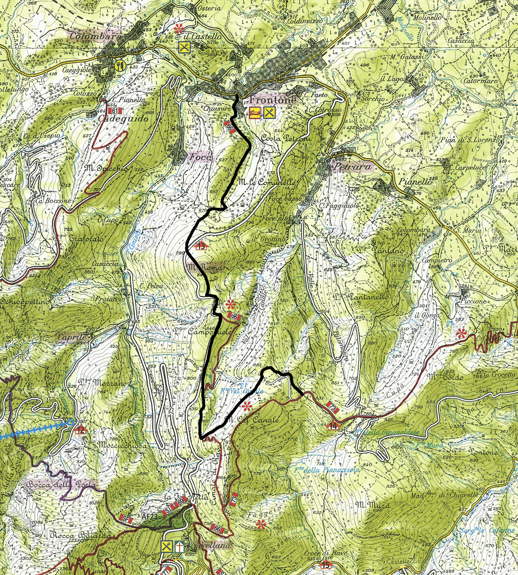 Si raggiunge quindi l'incrocio con il raccordo con il sentiero 73 (è presente una segnaletica di colore giallo e rosso), mediante il quale si può raggiungere la destinazione di Fonte Avellana, allungando però notevolmente il percorso rispetto alle indicazioni presenti sulla mappa.