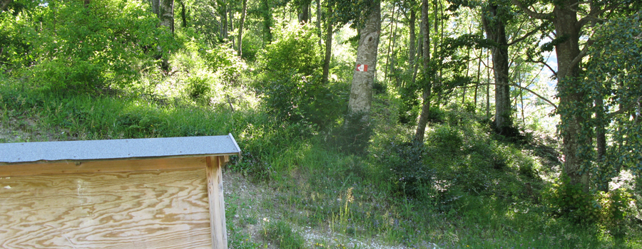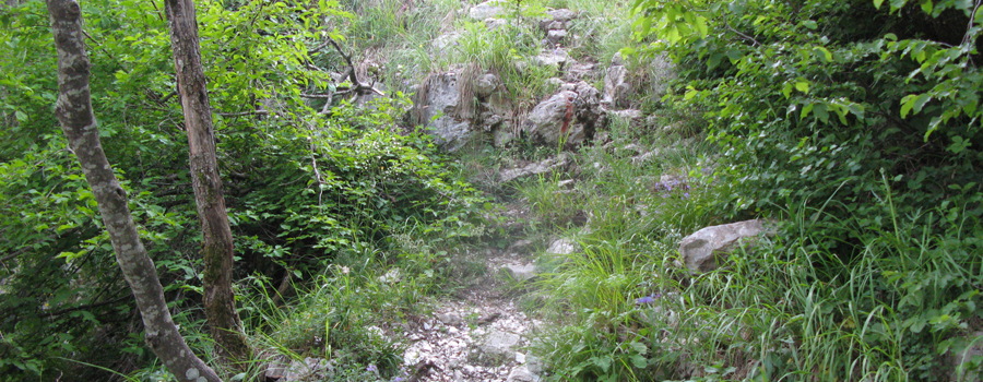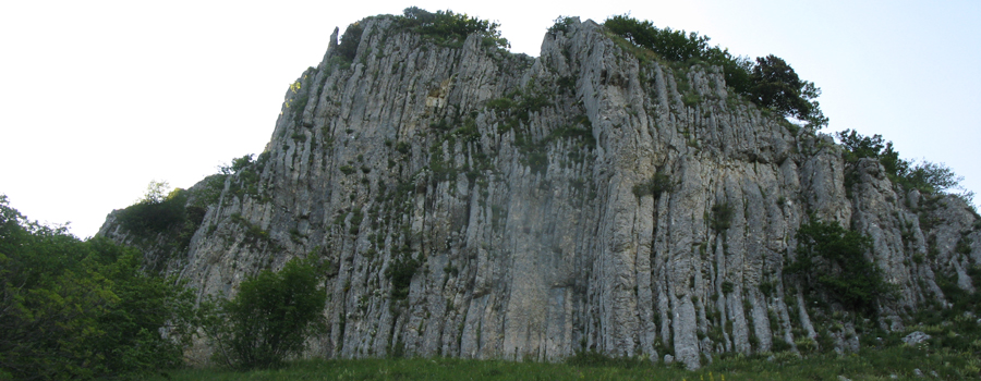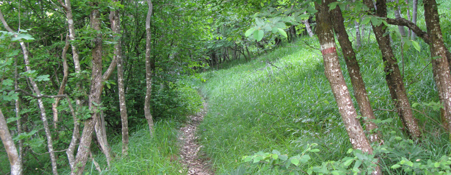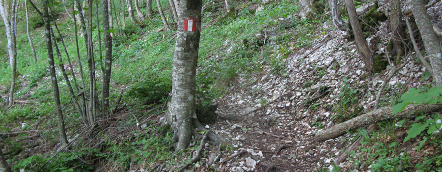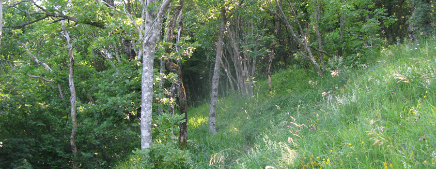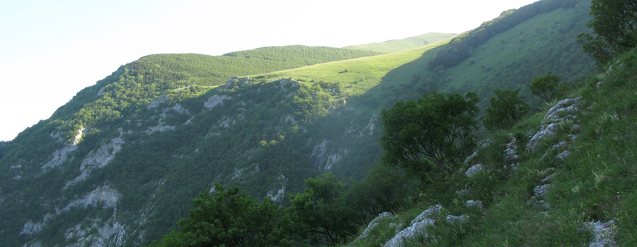 Qui l’ambiente è molto panoramico e non si può non volgere lo sguardo verso il basso, dove il monastero su cui è posta la partenza appare oramai lontano, 300 metri più sotto, incastonato nella sua magnifica valle, mentre sulla destra svetta la spettacolare parete di Rocca Baiarda che sovrasta il percorso con i suoi contrafforti rocciosi. Superato il traverso (fare attenzione ad alcuni punti un po’ esposti su alcune roccette che in caso di umidità possono diventare scivolose) si entra in un ampia faggeta e si riprende a salire, incontrando dopo poco il bivio (ben segnalato) con il sentiero dei Carbonai che sale anch’esso da Fonte Avellana, da superare guadagnando rapidamente quota fino ad uscire dal bosco in prossimità del versante superiore della Balza del Pluviometro (così chiamata dalla presenza in passato di un pluviometro del quale tuttavia non rimane alcuna traccia), che precipita per 2-300 metri sulla sinistra offrendo un magnifico scorcio sulla valle sottostante e sui rilievi circostanti (bella la vista sul Monte Strega, proprio di fronte).