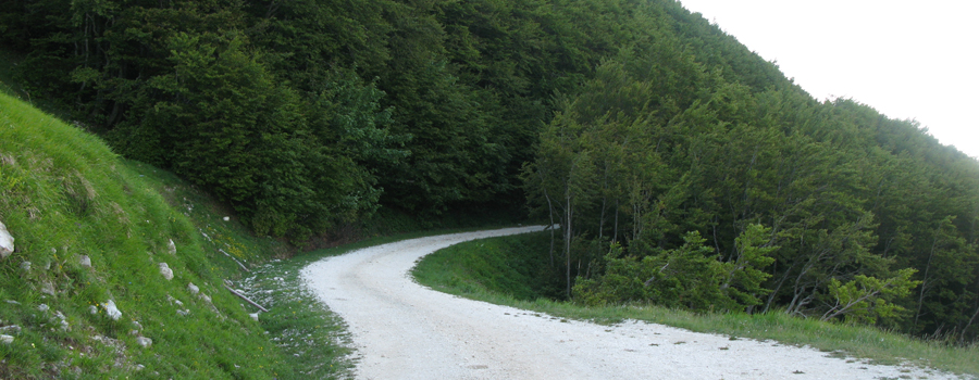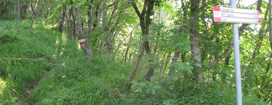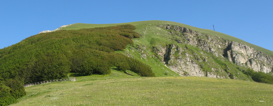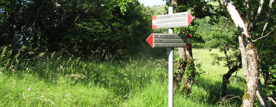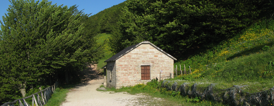 Sulla sinistra si trova invece uno scosceso pascolo che rappresenta una delle difficoltà maggiori di questo impegnativo sentiero, in quanto andrà risalito seguendo la linea di massima pendenza, guidati inizialmente da una staccionata e poi dal margine di un boschetto, fino a raggiungere la soprastante strada sbrecciata da imboccare verso destra, le cui pendenze molto dolci permettono di riposarsi dopo una fatica che fin qui è stata notevole. Si segue la strada per alcune centinaia di metri fino ad incontrare un bivio, dove si prosegue a sinistra in direzione del Rifugio Vernosa, termine del sentiero, che si raggiunge in pochi minuti. Il rifugio è un punto di snodo di molti sentieri, in particolare il Sentiero Italia prosegue sulla destra, perdendo quota, contrassegnato dal segnavia n. 55, mentre sulla sinistra si trova la via principale d’accesso alla vetta del Monte Catria, il sentiero 56, che permette in una mezz’ora di cammino di raggiungere il punto più alto della Provincia di Pesaro e Urbino.