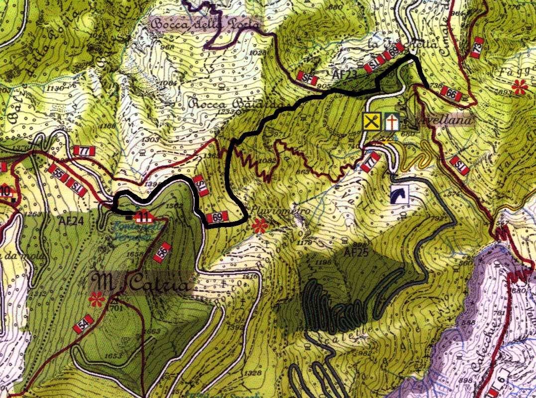 Il sentiero 69 (a cui recentemente è stato attribuito il numero 200, raggruppandolo ai restanti segmenti del Sentiero Italia) prende il via dal monastero di Fonte Avellana, dove si trova un ampio parcheggio per lasciare le vetture. Proprio dal retro del monastero si inizia a salire mediante alcune scalette che raggiungono una piccola costruzione, superata la quale si giunge in poco tempo ad una stradina sterrata dove si individuano i primi segni (qui piuttosto sporadici) del sentiero. Dopo una breve risalita si giunge al passo La Forchetta dove è situata una piccola edicola e da cui parte il sentiero vero e proprio, che si immerge nel bosco soprastante iniziando subito a salire con pendenze piuttosto importanti, seguendo la particolare cresta all’ombra della fitta vegetazione. Si incontra in breve tempo il bivio con il tratto finale del Sentiero Frassati, ben segnalato, che prosegue in discesa verso Fonte Avellana, mentre il Sentiero Italia continua decisamente a salire con brevi tornantini su fondo pietroso, ed il bosco circostante man mano cambia aspetto passando dagli alti fusti ad una vegetazione via via sempre più rada, fino ad uscire su di un bel prato, piuttosto scosceso, da attraversare compiendo uno spettacolare e lungo traverso.