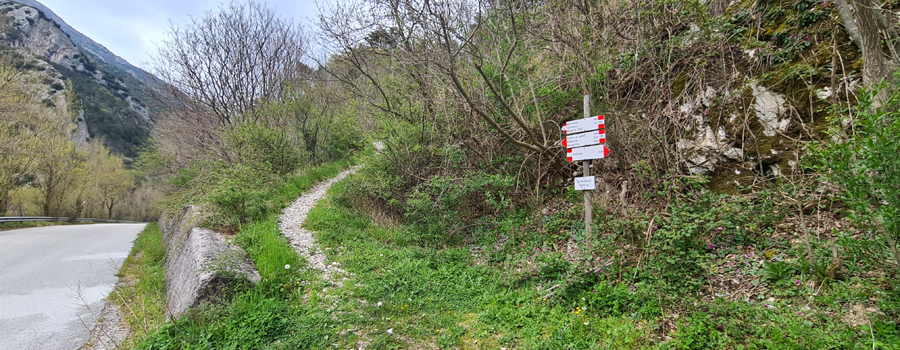 L’attacco del sentiero si trova sulla vecchia strada Flaminia, poco dopo aver superato le ultime case di Pontedazzo, ed è contrassegnato da un segno CAI sul muretto di destra, nel punto in cui, in una piccola apertura nello stesso, si diparte la ripida traccia che sale all’interno del bosco soprastante. (il punto di partenza è stato spostato un centinaio di metri più avanti, attenzione a non prendere il vecchio sentiero, il nuovo è contraddistinto da una tabella con i tempi di percorrenza)