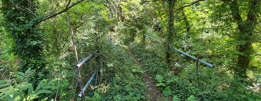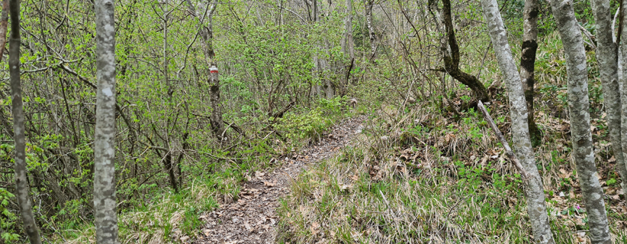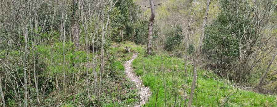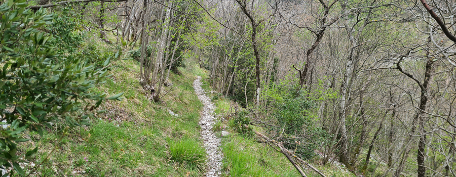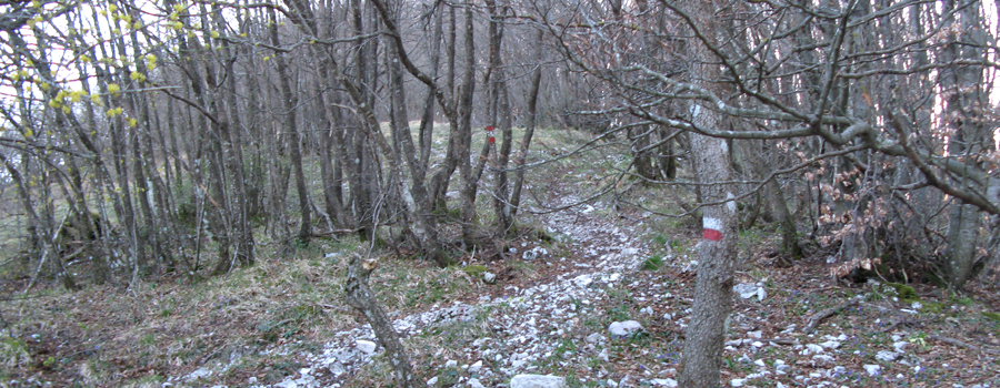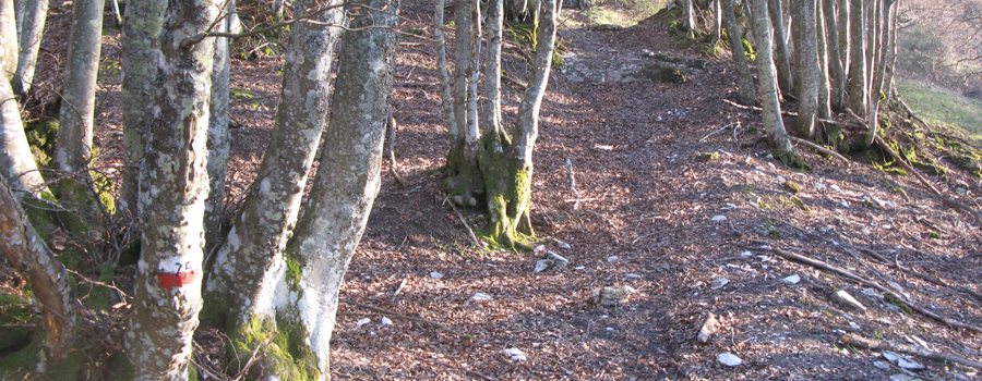 In questo punto l’ambiente cambia aspetto e ci si addentra in un bosco, seguendo una stradina con fondo pietroso, ancora in salita ma di media difficoltà.