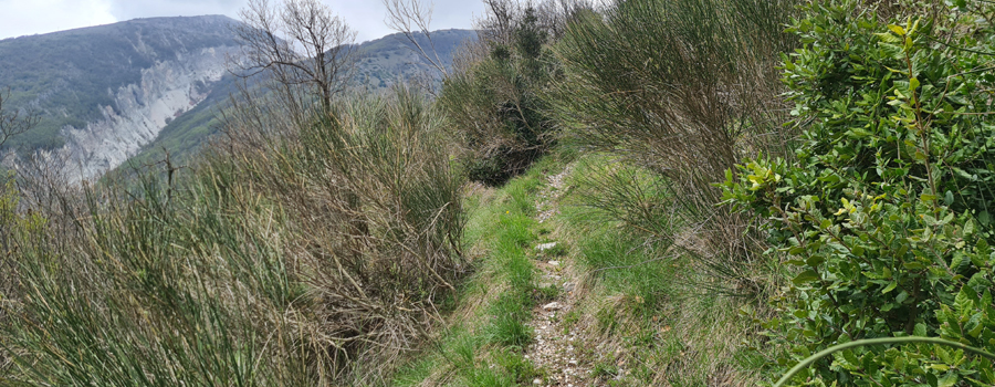 Al termine della prima parte della salita (quota 650, nei pressi di FonteLaLama) si lascia il Sentiero Italia, che scende a destra verso Cantiano e, subito dopo, si ricomincia a salire, prima in ambiente caratterizzato da arbusti di vario tipo, poi sui grandi prati dove la traccia diviene difficile da seguire ed occorre prestare attenzione ai segni presenti su roccette, alberi sporadici e pali. Ad un certo punto si effettua un lungo traverso in direzione est che, superato un piccolo impluvio circondato da alberi, conduce alla cresta del Monte Tenetra, con panoramica vista su Cantiano e sulla valle sottostante.