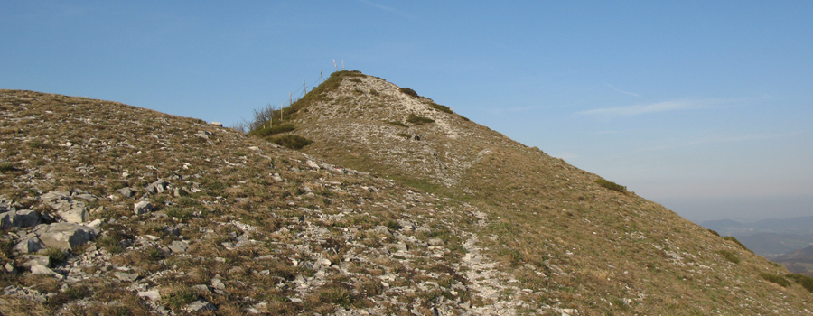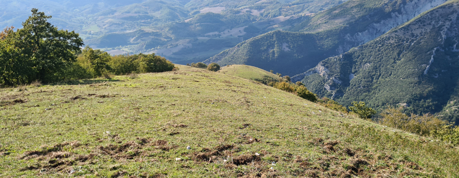 Si prosegue seguendo la traccia evidente, ancora in decisa salita, fino alla vetta di una piccola altura che presenta, volgendosi verso nord, un bel panorama su gran parte della provincia, dalle colline fino al mare..