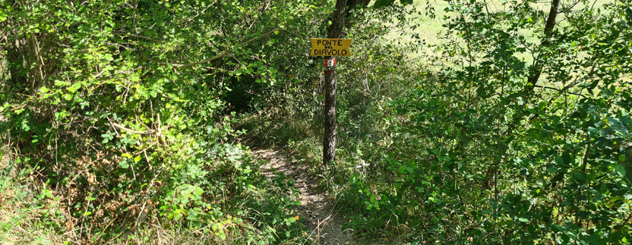Si svolta a sinistra superando il torrente mediante il cosiddetto "Ponte del Diavolo", quindi si imbocca una nuova sbrecciata (verso destra) che si percorre per circa 200 metri prima di iniziare a salire sui prati (svolta a sinistra) ed affrontare un tratto con discreta pendenza prima su prato e poi all’interno del bosco composto da alberi a basso fusto, arrivando a costeggiare un muretto di pietre che anticamente segnava il confine del territorio di Acquaviva; svoltando successivamente a destra si raggiunge un nuovo tratto su ampio prato, presentante una salita con pendenza marcata, con punto di sosta a circa metà strada rappresentato da una prima fontana che si raggiunge discendendo 10 metri sulla sinistra rispetto alla traccia principale.