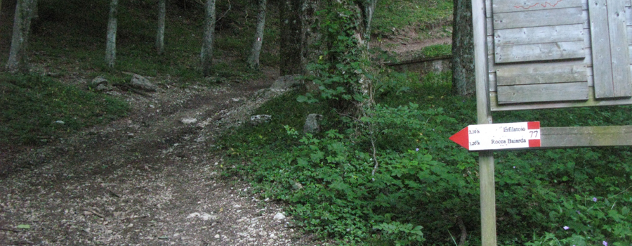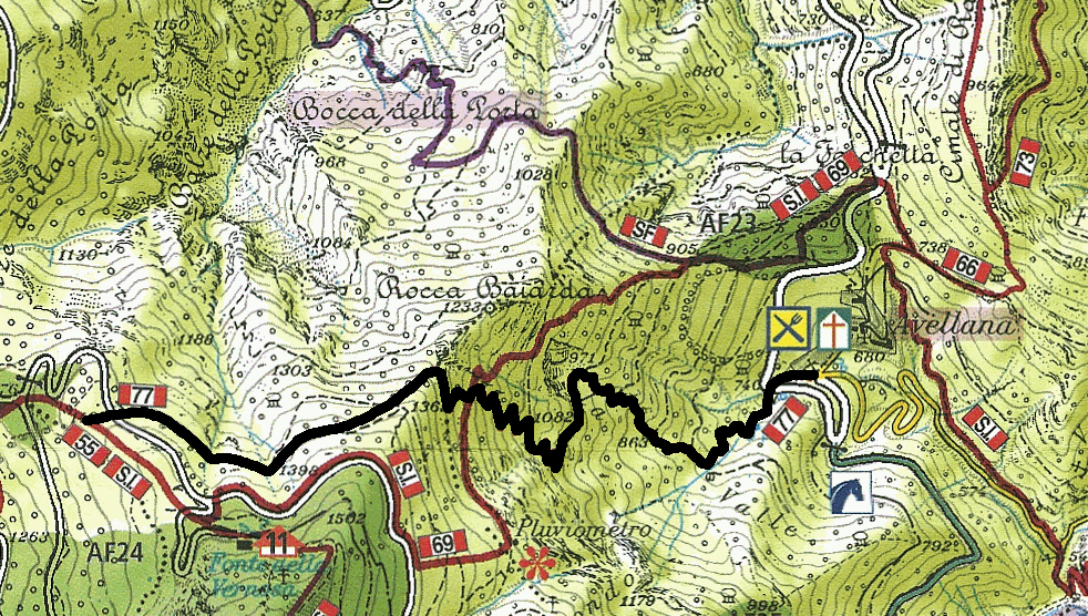 Il sentiero prosegue molto ben segnalato e praticamente impossibile da sbagliare fino all’incrocio con il Sentiero Italia (n. 69), in corrispondenza del quale si svolta prima a sinistra ed immediatamente dopo a destra (segno n.77 evidente), per proseguire ancora all’interno del bosco in una ulteriore serie di curve che conduce ad una sella dove è presente un vecchio bottino dell’acqua.