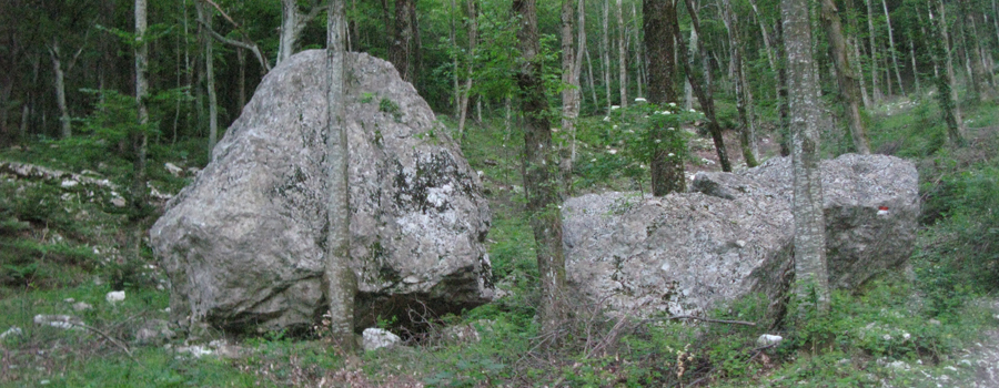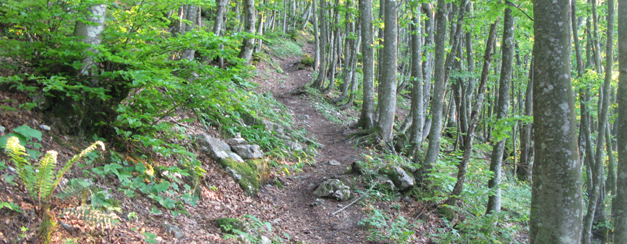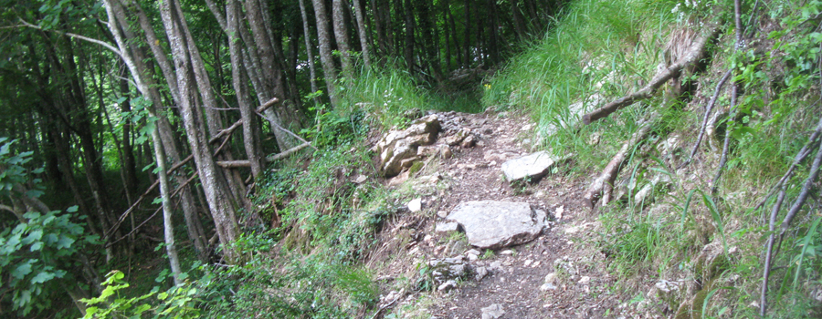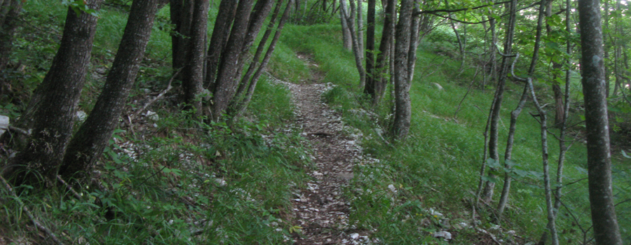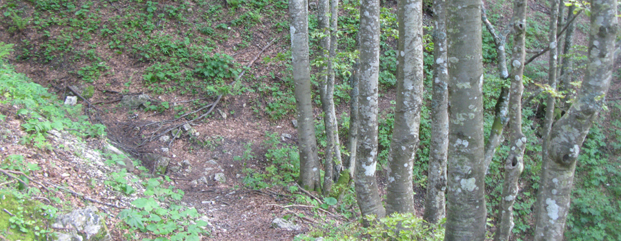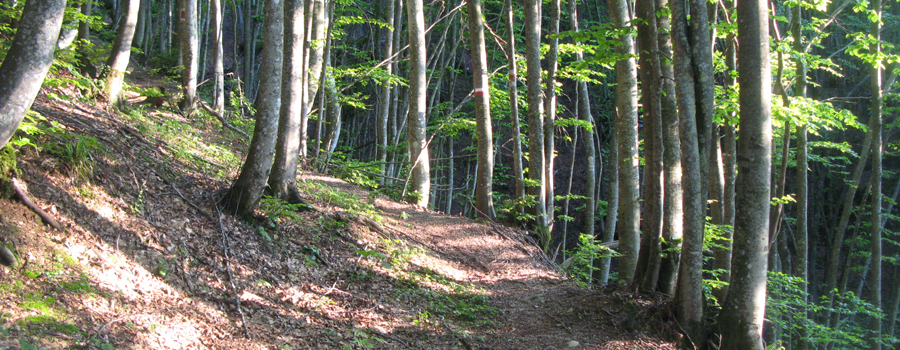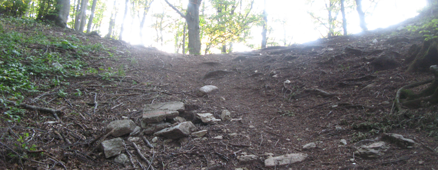 In questo punto la pendenza si fa più dolce e si prosegue lungo un comodo traverso che permette di respirare dopo la notevole fatica compiuta nel tratto precedente. Anche qui la segnatura è ottima, occorre solamente prestare attenzione a non seguire una indicazione (sbagliata) di svolta a sinistra mentre la traccia prosegue verso destra, divenendo incerta per un attimo ma tornando subito dopo ad essere evidente. Il tratto in falsopiano è piuttosto lungo, e si snoda all'interno del bosco attraversando tre impluvi, normalmente privi di acqua e facili da superare, terminando dopo circa mezz'ora di cammino ai piedi dell'ultima salita, breve e caratterizzata da pendenze non certo proibitive.