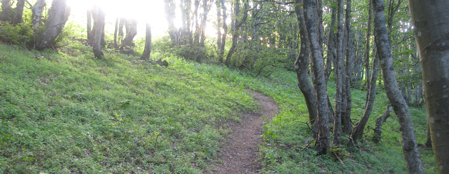 Il percorso si snoda all’interno del bosco, nel versante nord del Monte Catria, attraverso ripidi tornanti che attraversano antiche carbonaie. La pendenza è subito importante, facendo subito intuire le difficoltà che si dovranno affrontare per giungere in vetta. In questo primo tratto oltre alle carbonaie si può notare la presenza di diversi grossi massi di roccia nelle vicinanze del percorso.