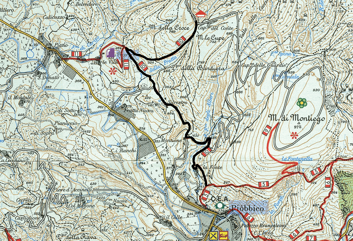 Il tracciato è raggiungibile percorrendo la primissima parte del sentiero 5, che sbuca in salita proprio dall'interno dell'abitato di Piobbico, fino ad un evidente bivio (dove è presente un segno in terra con il numero 10), in corrispondenza del quale occorre svoltare a sinistra ed iniziare a percorrere, in falsopiano, il percorso vero e proprio.