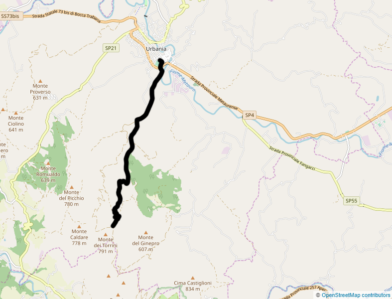 Il punto di partenza del sentiero si trova nei pressi del centro storico di Urbania, per comodità si consiglia di utilizzare l'ampio parcheggio adiacente il campo sportivo, dove è presente anche una fontanella per il necessario rifornimento idrico prima di iniziare il cammino.