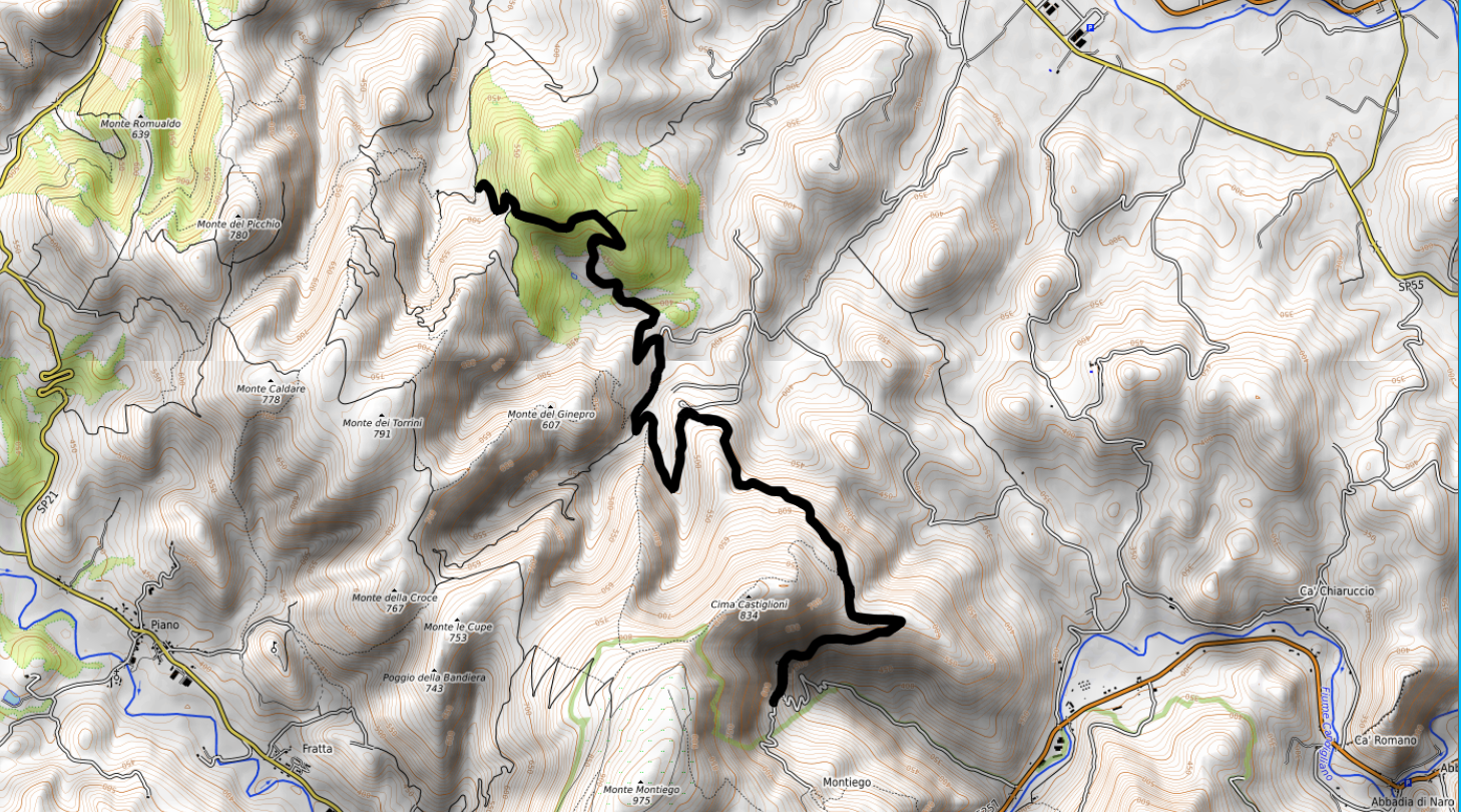 Al termine del tratto più intricato si sbuca su una ampia strada sbrecciata e si inizia a salire repentinamente, guadagnando in breve tempo circa 200 metri di quota, oltrepassando alcune case sparse ed incrociando il sentiero 466 (sale sulla destra verso la Cima Castiglioni) e raggiungendo infine un bel punto panoramico, con vista notevole sul Monte Nerone e sulle pendici del Monte di Montiego che terminano con la Balza della Penna.