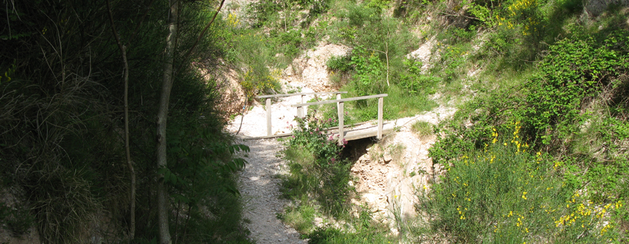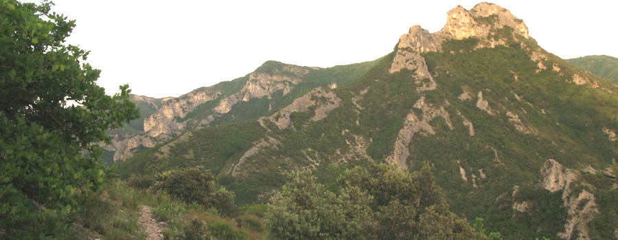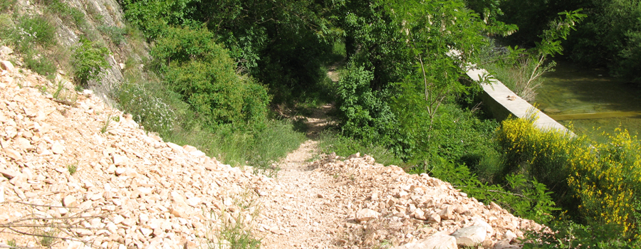 Si imbocca una evidente traccia che costeggia il Candigliano, che si segue per circa 1 km, lasciandosi gradualmente alle spalle il paese ed entrando nella bella gola che il corso d'acqua ha scavato nel corso dei millenni tra il Monte di Montiego e il Monte Nerone, con viste panoramiche veramente notevoli.