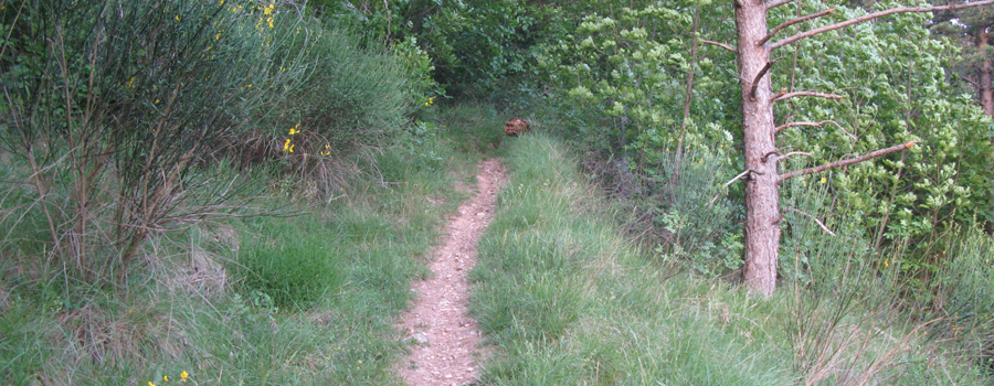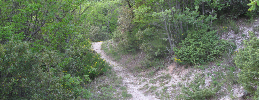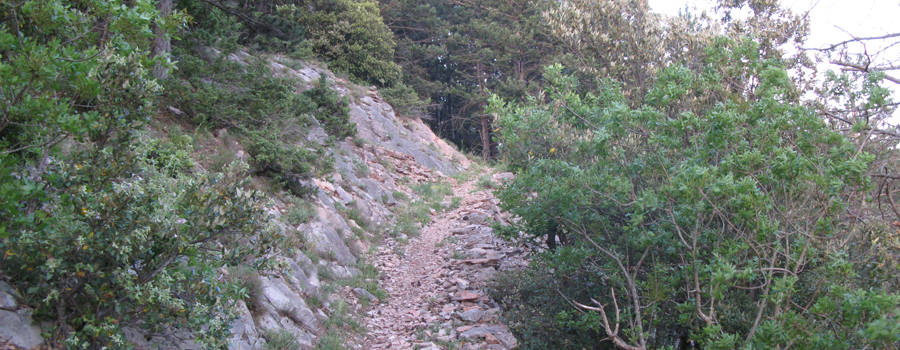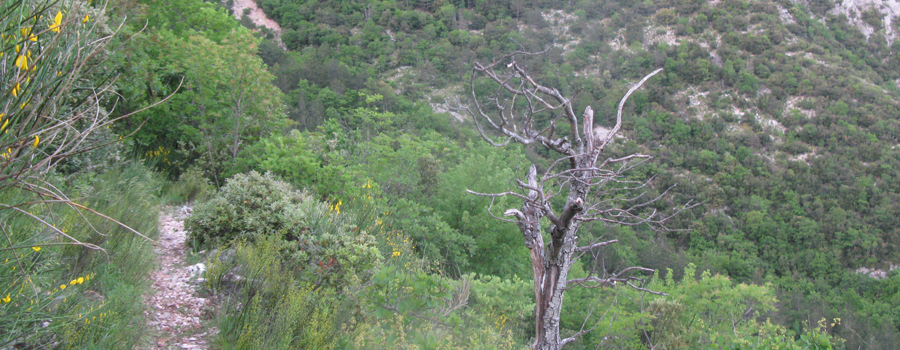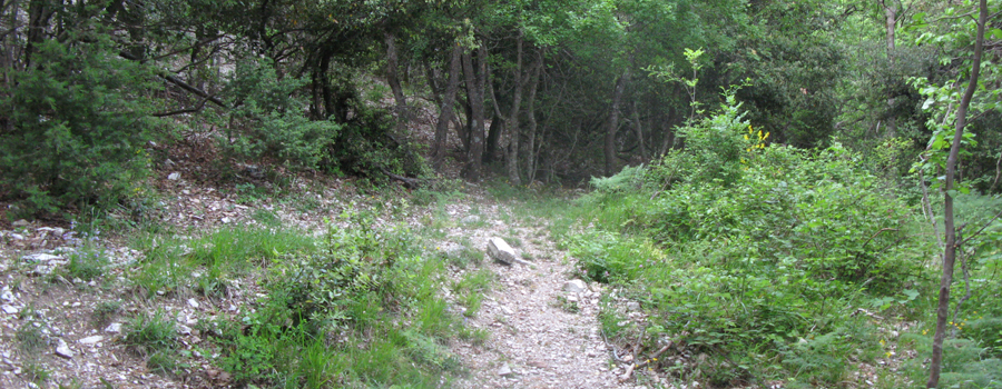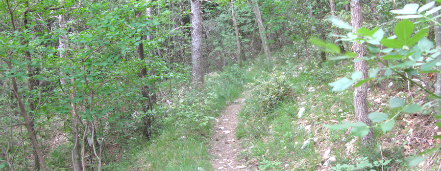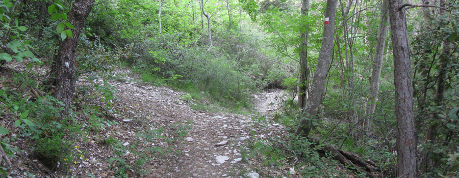 Il paesaggio cambia piuttosto radicalmente quando si raggiunge quota 450 metri, nel punto in cui il sentiero effettua una repentina svolta verso sinistra, immergendosi completamente nell'ambiente boschivo, con le pendenze che si fanno via via più marcate. In questo tratto la segnaletica è stata risistemata di recente, permettendo di mantenere agevolmente la via corretta, nonostante siano presenti diverse tracce secondarie che potrebbero indurre in errore.